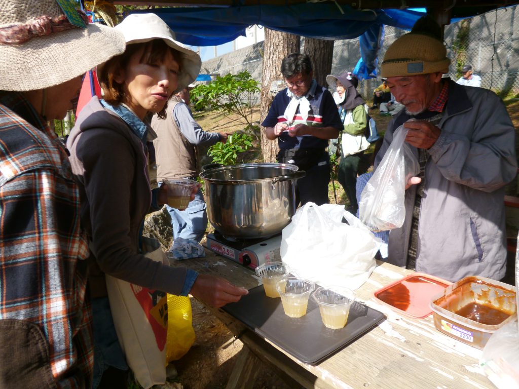 テントでは、温かい味噌おでんの差し入れが待っていた。アツアツの大根とこんにゃくをいただいた。