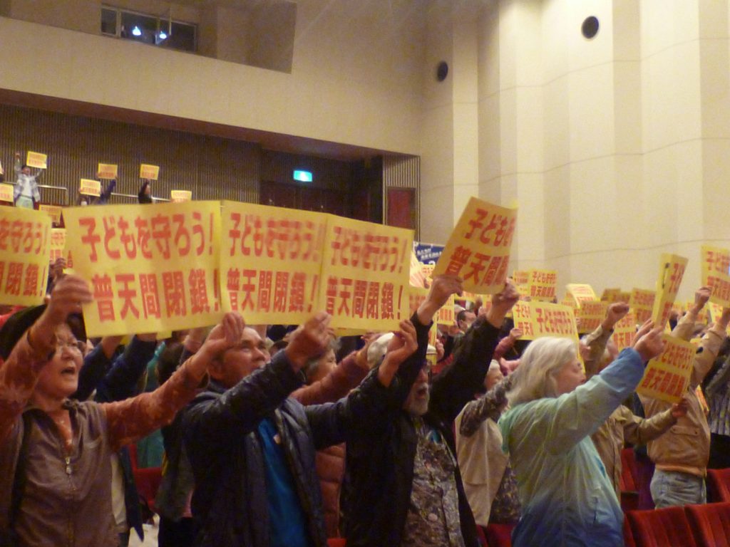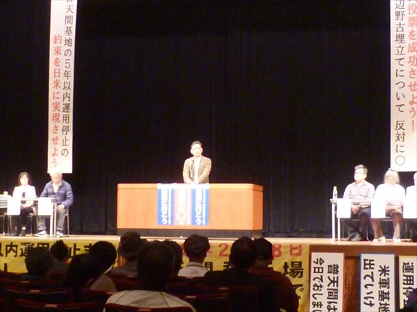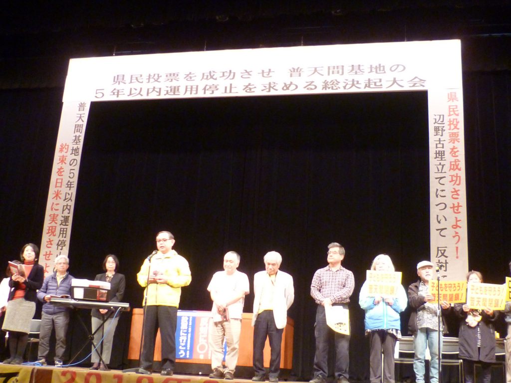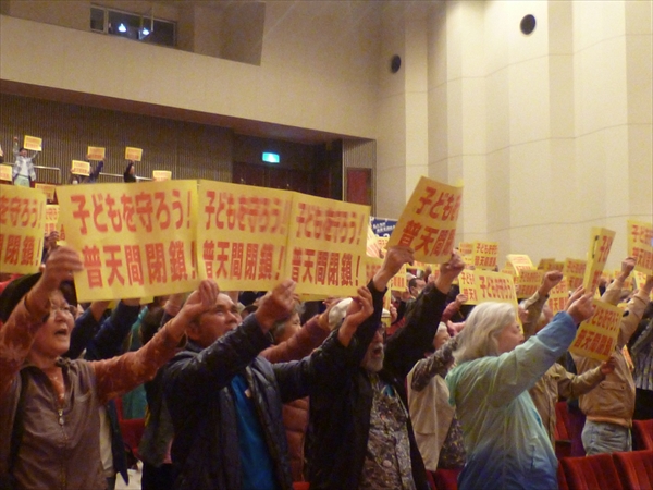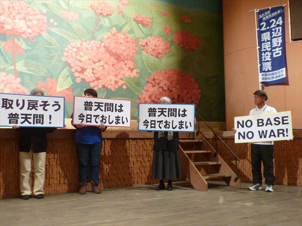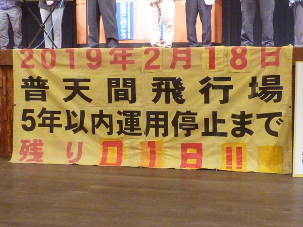 2014年2月、安倍総理が仲井間元沖縄県知事に約束した「普天間5年以内運用停止」まで残り一日となった昨日(17日)、宜野湾市民会館で「約束実行を求める総決起集会」が行われた。