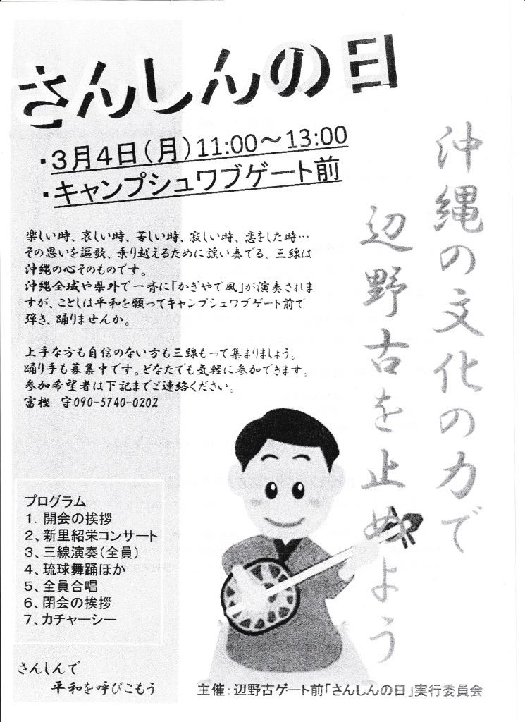 辺野古で 平和を唄おう!踊ろう!さんしんの日 2017年の「さんしんの日」より(辺野古にて) 沖縄~平和のメッセージ 2019年2月24日unaiリンクURL この記事を共有する → Tweet Pin It
