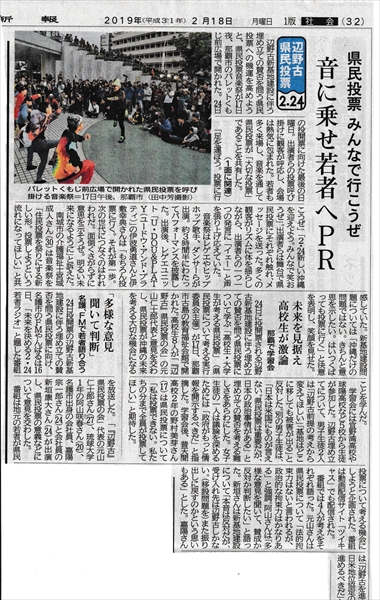 県民投票 若者たちが熱い! ~ 県民投票を成功させよう⑬ 2月24日の県民投票間まで、一週間を切った。 地元メディア・琉球新報、沖縄タイムスと、共同通信社の三社が世論調査を行った結果、「投票に行く」が94%、そのうち辺野古反対67%、賛成はわずか15.8%だった。 また、玉城デニー知事の支持率は79%に上った。(18日琉球新報) そして、これまで政治に無関心と思われていた若者たちの動向が様変わり。賛成、反対にかかわらず、若者たちが積極的に行動を起こしていることが、なにより興味深い。 地元新聞の記事より, 沖縄~平和のメッセージ 2019年2月18日unaiリンクURL この記事を共有する → Tweet Pin It