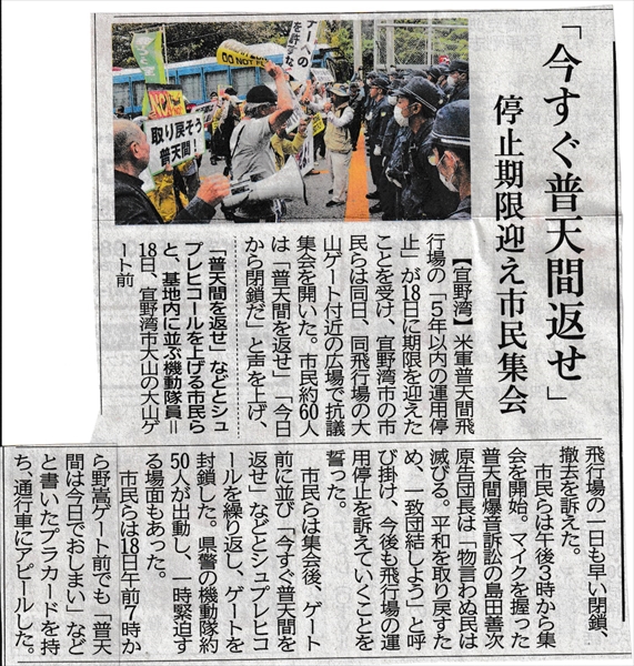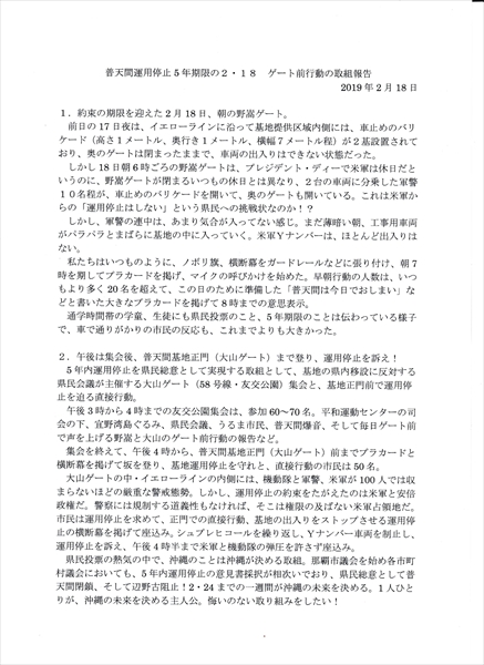 「普天間は今日でおしまい!」 <Ⅱ> 18日、大山、野嵩ゲート前で抗議行動 17日に「普天間運用停止 約束実行を求める総決起集会」を開いた市民らは、期日を迎えた18日早朝も、普天間基地のゲート前で抗議行動を展開した。 <19日 琉球新報> 17、18両日の集会ついて、普天間爆音訴訟の事務局から下記のような報告が届いた。 地元新聞の記事より, 沖縄~平和のメッセージ 2019年2月21日unaiリンクURL この記事を共有する → Tweet Pin It