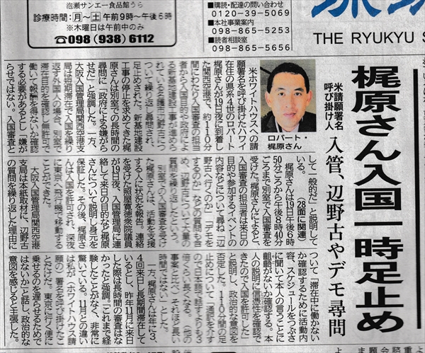 国の弾圧続く ~ 梶原さん 入管で一時足止め 国の、沖縄、辺野古への姑息ないやがらせ、弾圧が相次いでいる。 沖縄県の「撤回」を、無効にした国土交通省の決定を不服として、県が申し立てていた審査請求を、「国地方係争委員会」は18日、「不適法」として、審査もせずに入り口で門前払いにした。 同じく18日、ホワイトハウスへの請願署名を呼びかけ21万筆を集めたハワイ在住ロバート・梶原さんが、成田空港の入国審査で、2時間にも渡って審問を受け、足止めされた。 地元新聞の記事より, 沖縄~平和のメッセージ 2019年2月21日unaiリンクURL この記事を共有する → Tweet Pin It
