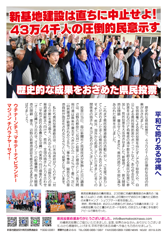 県民投票ニュース 第21号 ~ 世界も、全国も注目した県民投票 県民投票の結果を受けて、特に県外、外国の友人知人から「よかったね」「ありがとう」「感謝!」などの祝福やねぎらいのメール、おたよりをたくさんいただきました。特に私が何かをしたわけではないのに、です。皆さんが我ことのように喜んでくれました。 こちらこそ、多くの方々からいただいた物心両面にわたる多大な支援に感謝いたします。 <県外の友人からいただいたはがきです↑> <県民投票連絡会ニュース21号> 沖縄~平和のメッセージ 2019年3月1日unaiリンクURL この記事を共有する → Tweet Pin It