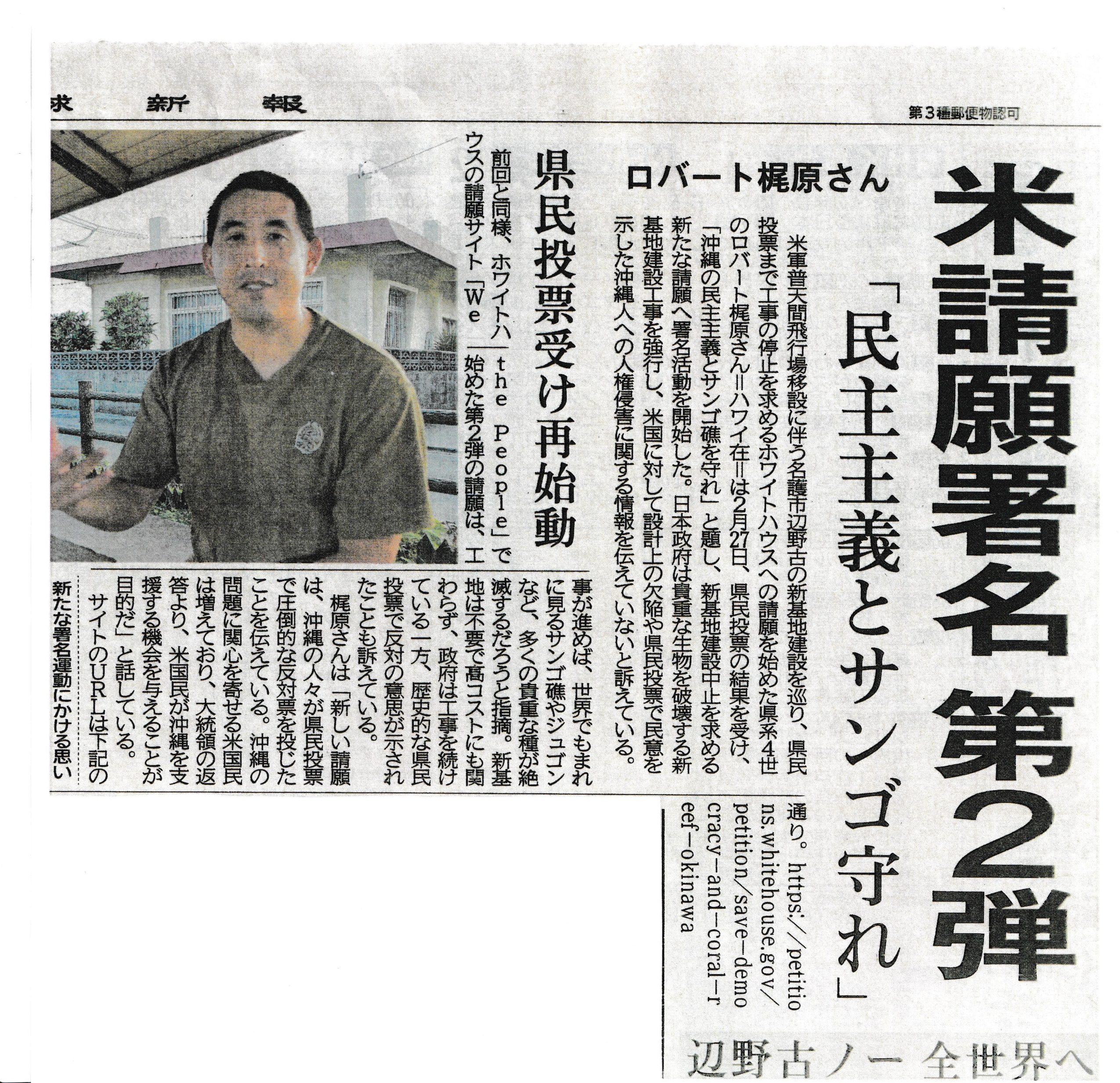 名護市辺野古の新基地建設を巡り、県民投票まで工事の停止を求めるホワイトハウスへの請願を呼びかけ、21万署名を集めて注目された県系4世のロバート梶原さん(ハワイ在住)が、県民投票の結果を受け「沖縄の民主主義とサンゴ礁を守れ」と題し、新基地建設中止を求める新たな請願へ署名活動を開始しました。