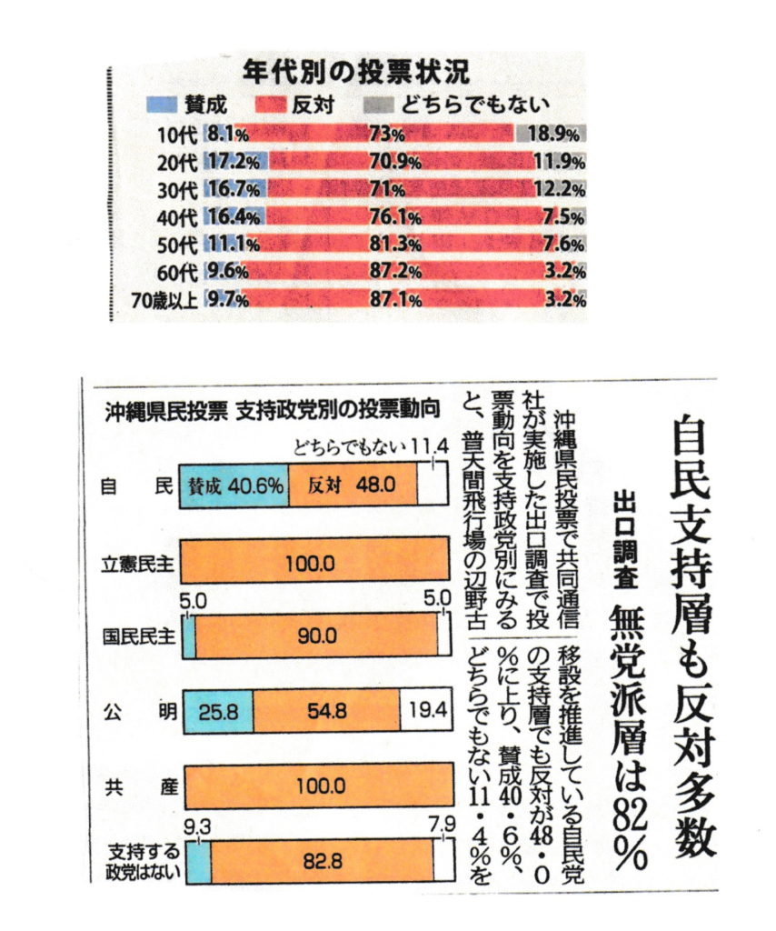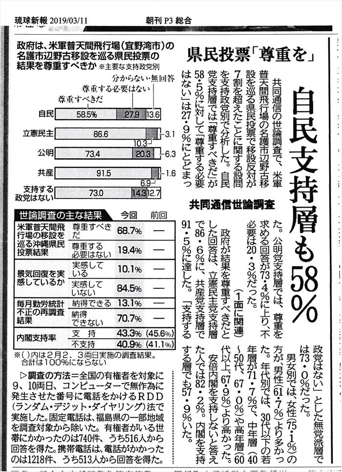 自民党支持層も反対多数 ~ 数字に見る 県民投票 政府自民党(安倍政権)は、沖縄県民投票の結果を矮小化しようと躍起になっているが、そうすればするほど裏目に出ていることが、様々なかたちで露呈している。 共同通信が行った世論調査で、沖縄だけでなく全国的に自民党支持層も58%、同じく政府与党の公明党支持層では73%が「県民投票の結果を尊重すべき」としていることが明らかになった。 <3月11日(月) 琉球新報朝刊より> また、実際に投票した人たちの出口調査では、自民支持者も反対が多数、年代別でもすべての年代において反対が上回っている。 地元新聞の記事より, 沖縄~平和のメッセージ 2019年3月12日unaiリンクURL この記事を共有する → Tweet Pin It