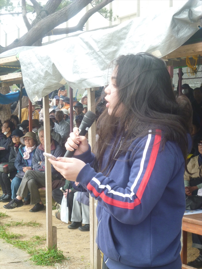 米国オレゴン州から来た県系二世の高校生。基地に向かって米兵へ英語で呼びかけた。「両親の故郷沖縄・辺野古のことを知って、驚き、悲しかった。ここに抗議のため集まっている人たちは、反アメリカではなく、ただ平和に安心して暮らしたいだけだ。基地の中の人たちにも知ってほしい。