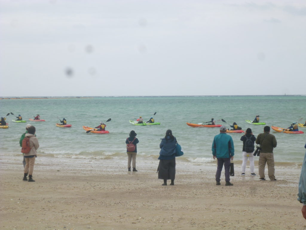 浜での集会終了後、辺野古ブルーのカヌーは、集会参加者に見送られて、再び波の高い海上へ漕ぎ出て行った。