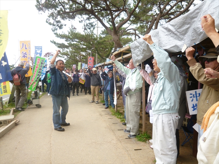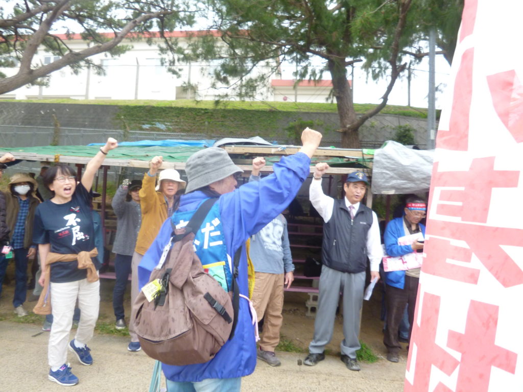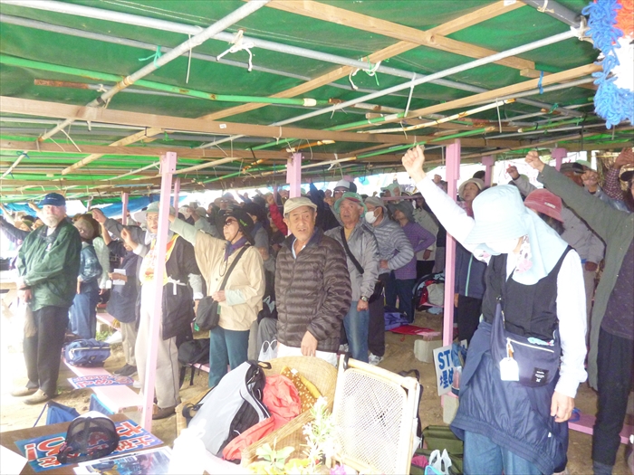 この日は、風が強く波も高い状況の中、海上からの搬入を阻止するため、早朝から抗議船8隻とカヌー47艇が海上大行動を展開。ゲート前行動も海が見える第三ゲートから海上の辺野古ブルーに応援の声を送ったあと、10時過ぎから座り込みテントで集会を開いた。