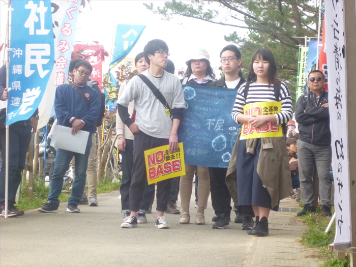 県民投票のアピールのため、南部戦跡の摩文仁から、ここ辺野古まで、二日間かけて歩き通した若者たちもかけつけた。二人は17歳、投票権はなかったが「私たちの未来に基地はいらないと意思表示したい」と。