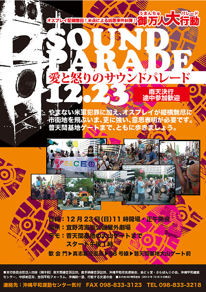 12月23日 「御万人大行動」に参加しよう!! オスプレイ配備撤回!米兵による凶悪事件に抗議する 愛と怒りの大パレードです。 音楽、パフォーマンス、仮装、何でもありの 楽しいデモ行進をめざしています。 あなたはどんなアイディアで参加しますか? チラシをしっかり読みたい方は 画像をクリックして下さい! 拡大表示します。 沖縄~平和のメッセージ 2012年12月20日unaiリンクURL この記事を共有する → Tweet Pin It