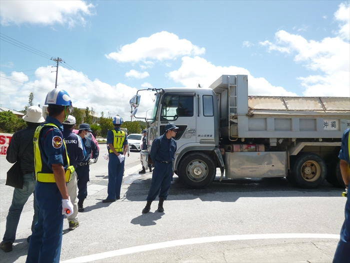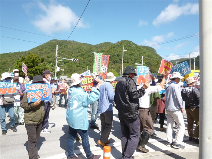 ここは安和桟橋の本来の出入り口ではなく、辺野古土砂用ダンプトラックの出口として臨時に開けられたため、道路に出るための信号機がなく、直進の車が途絶えたときしかダンプが出られない。また舗道は通る人が優先である。この日は交通量が多く、抗議行動の参加者も多かったため、なかなかダンプが出られなかったのだ。