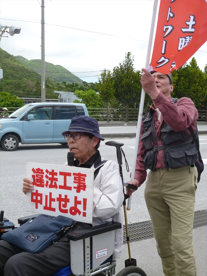 沖縄と同じく米軍基地を抱える岩国から13人が参加。今日から4日間、安和、辺野古、高江の現場へ行くとのこと。もともとは原発反対の運動をしている仲間たち(50年前の大学の仲間たち)が、沖縄に連帯しようと3年前から毎週土曜日にビラ配りや、デモなど継続して行動を起こしているのだという。この他、山口、京都、神奈川からも参加していた。