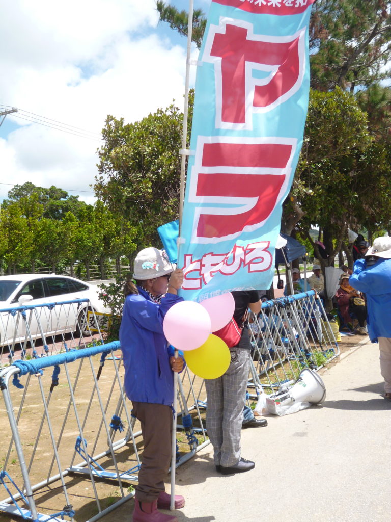 安和でも、トラックの阻止行動をしながら、オール沖縄候補、玉城デニー知事の後継者である屋良さんのアピール行動も合わせて行われた。
