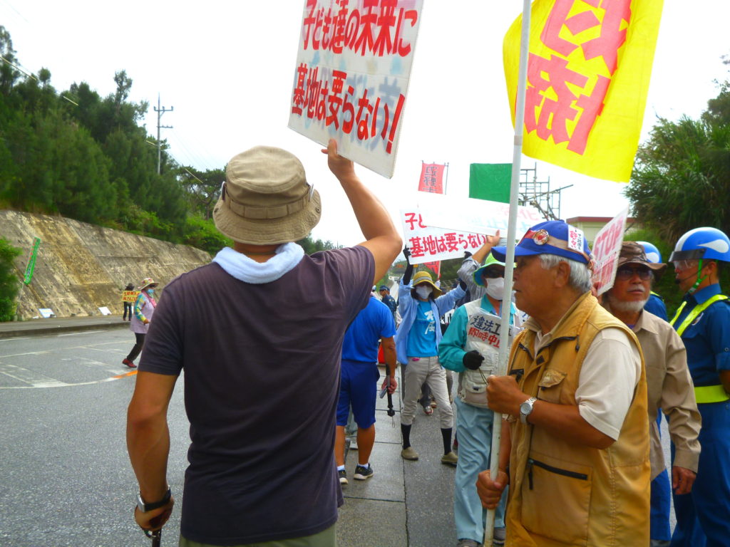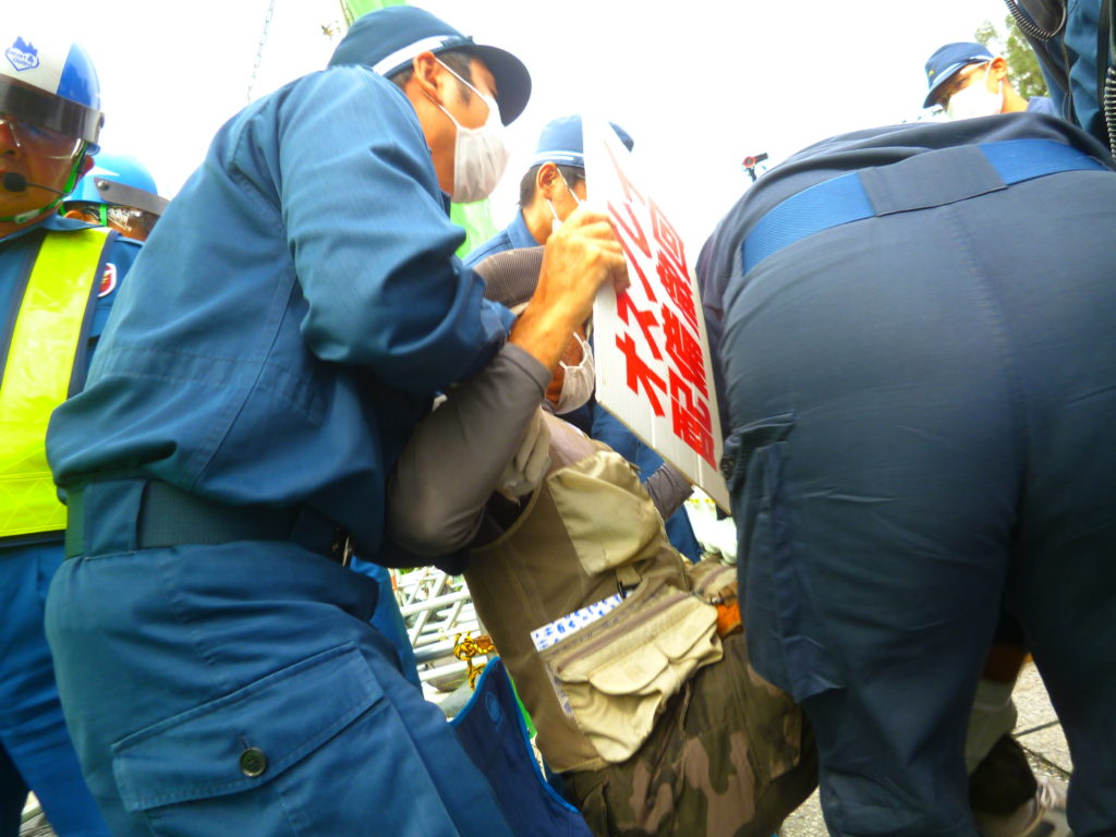 車両が入り終わった後はゲート前でデモ行進で抗議行動を続ける。