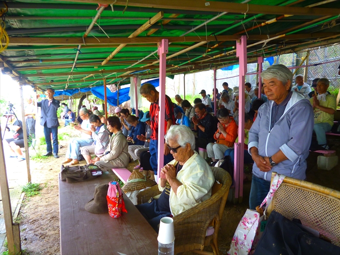 当時、米軍は沖縄本島に上陸すると同時に、戦闘を進めながら、すべての住民を捕虜として強制的に拘束・収容した。ここキャンプ・シュワブは、住民の強制収容所となった場所の一つ。ここには、まだ収骨されないまま地下に眠る戦争被害者の遺骨があり、今日は10:00からその慰霊祭が行われた。