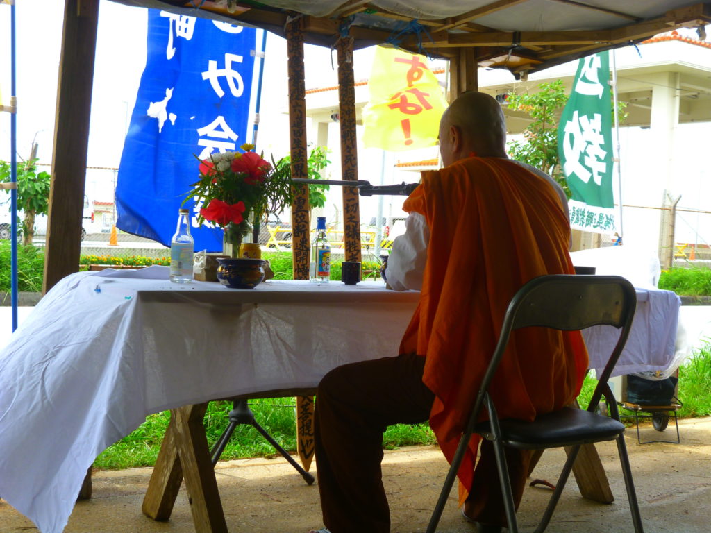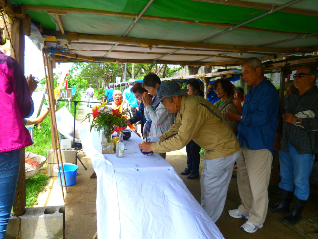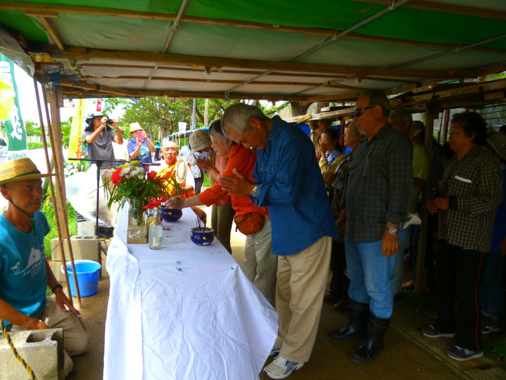 黙とうのあと、お坊さんによる読経の中、全員が線香を手向けて、沖縄戦の全戦没者と、辺野古崎に眠る遺骨へ鎮魂の祈りをささげた。