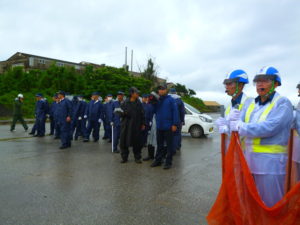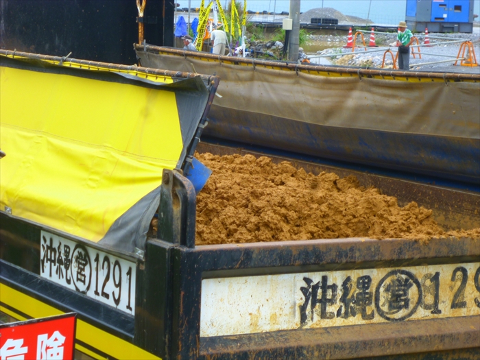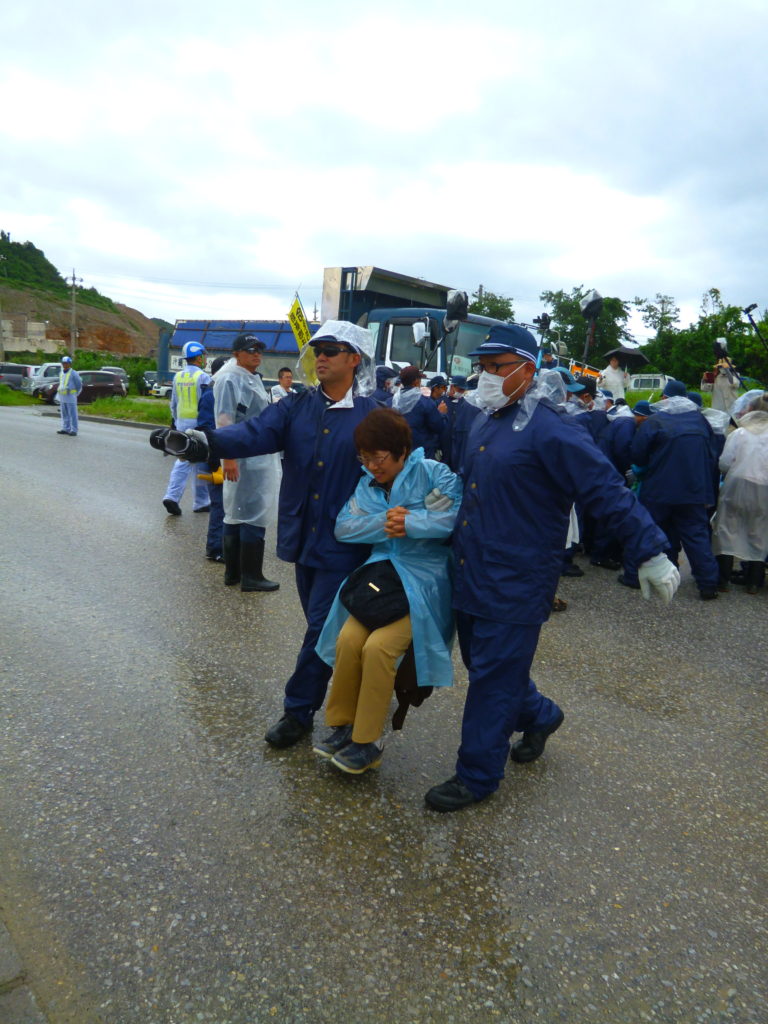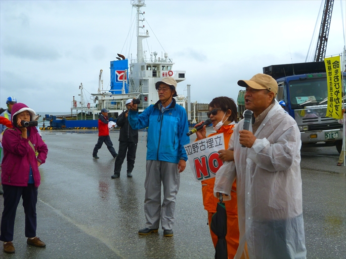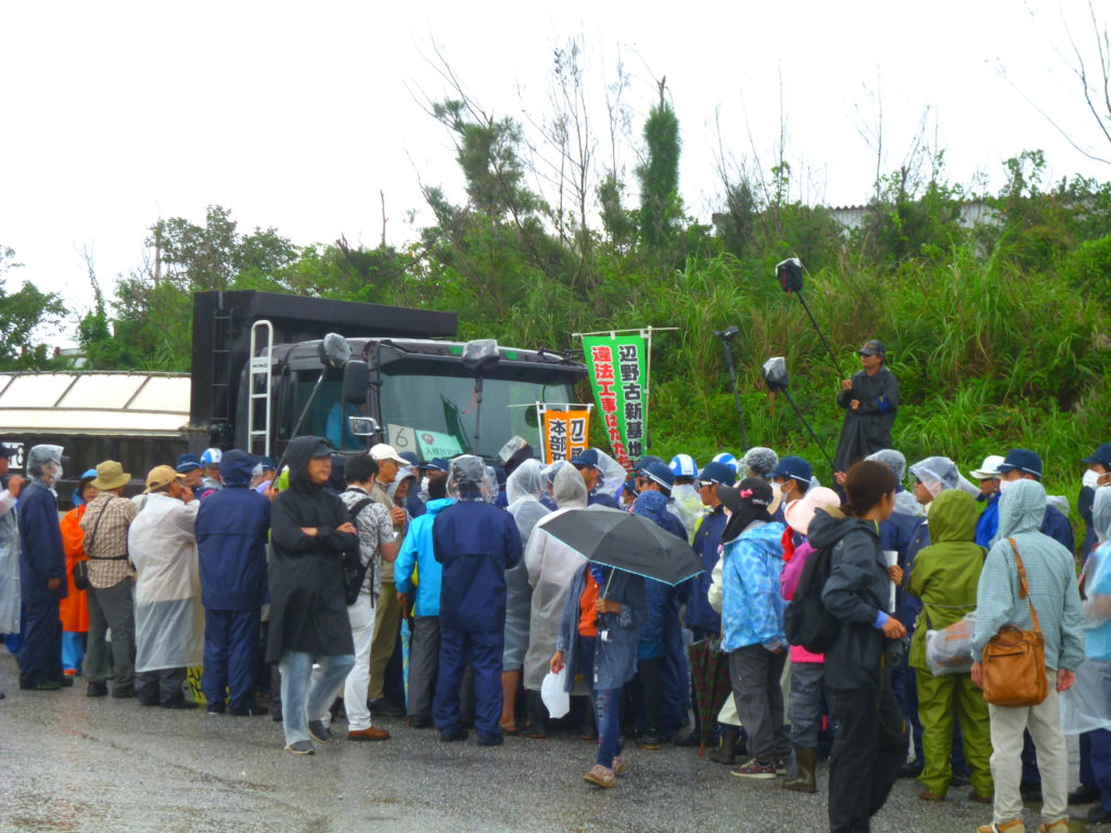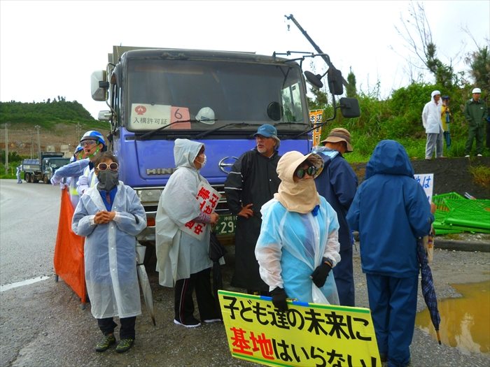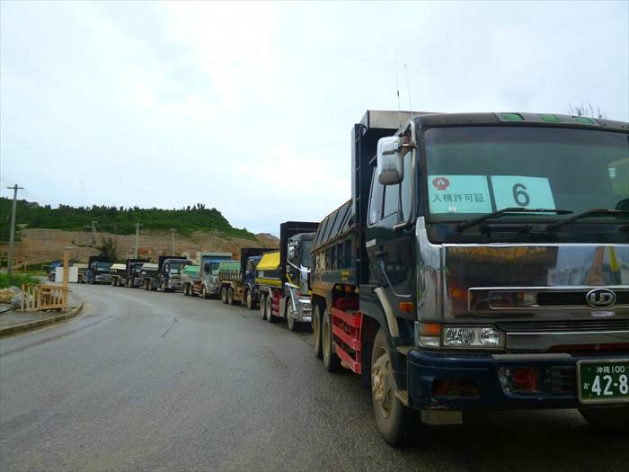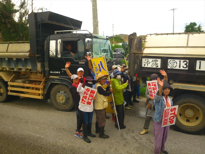 11:00前、本部・塩川港に着くと、山城博治さんの指揮のもと、土砂を積んで港に入ってくるダンプと、土砂を船に降ろし出ていこうとするダンプの前に人々が立ちはだかり止めていた。