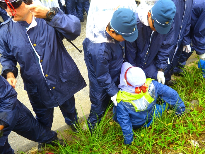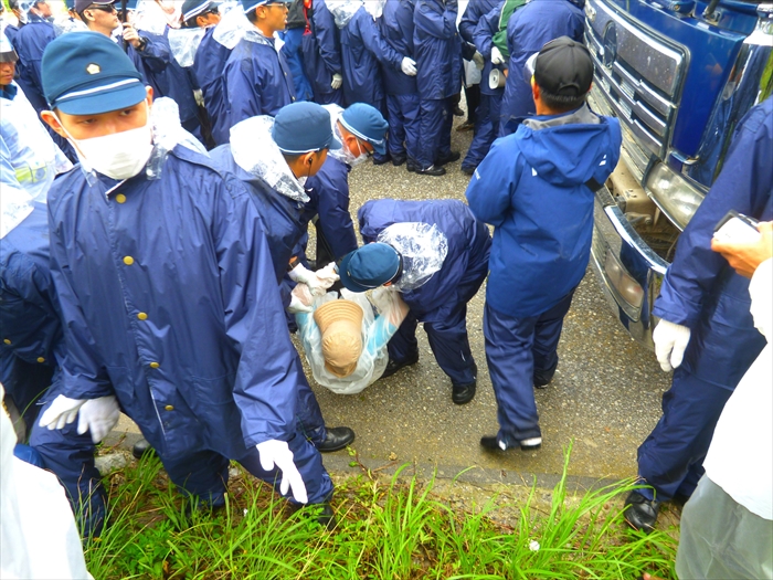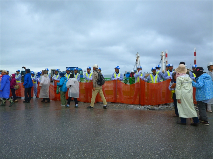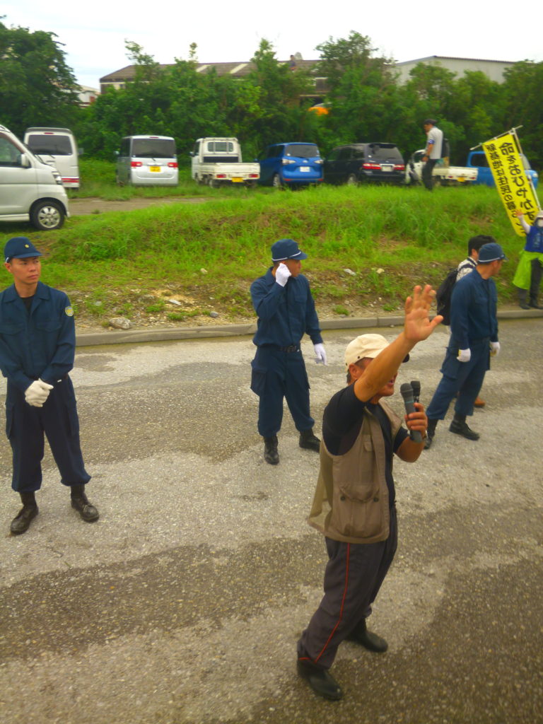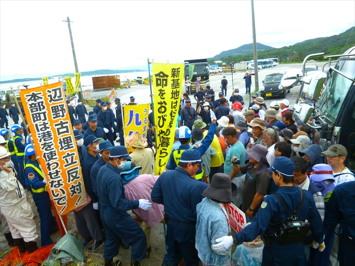 港の中を民間の警備員がオレンジ色の網で仕切り、機動隊はその奥で、人々の動きを見つめて控えている。機動隊が動けないのは、「公共の港を一業者が勝手に網などをもって仕切ることは違法だ」と、県が許可しなかったためで、何かをきっかけに動き出すチャンスを見極めているようだった。
