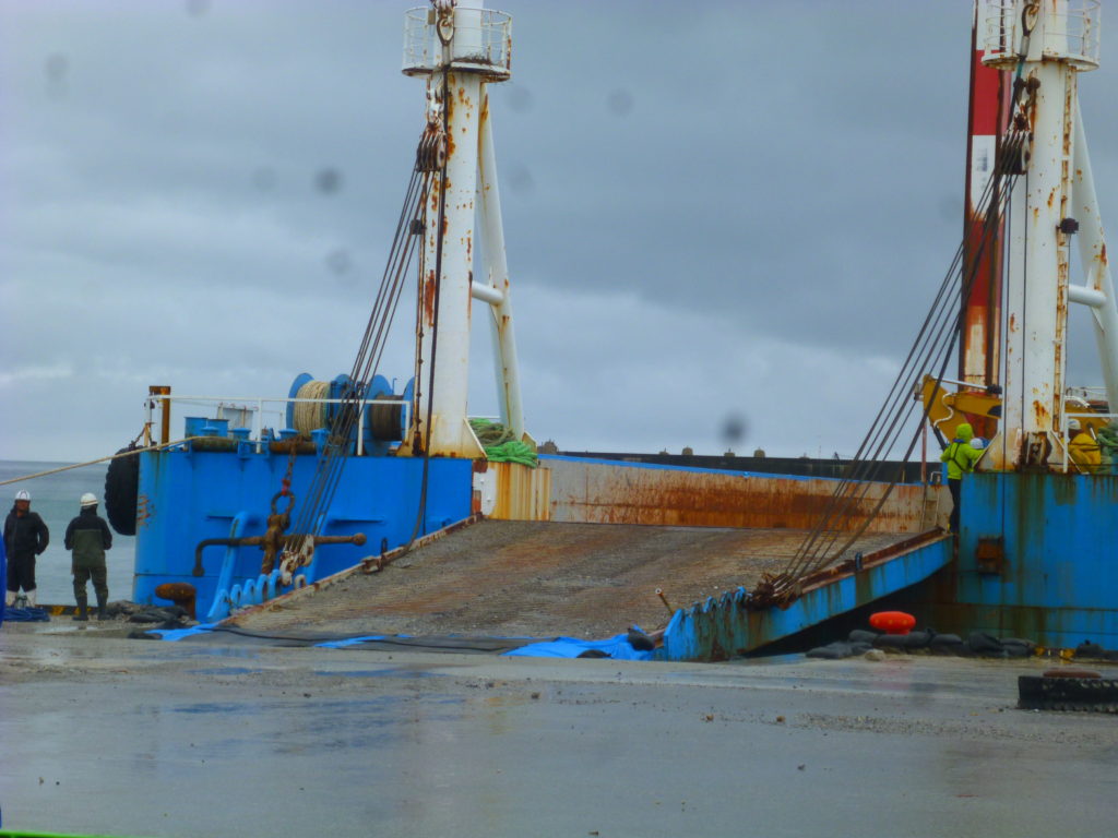 オレンジの網の向こう側にある桟橋では、空の土砂運搬船が入り口を開けて停泊していた。