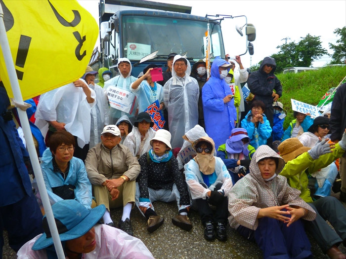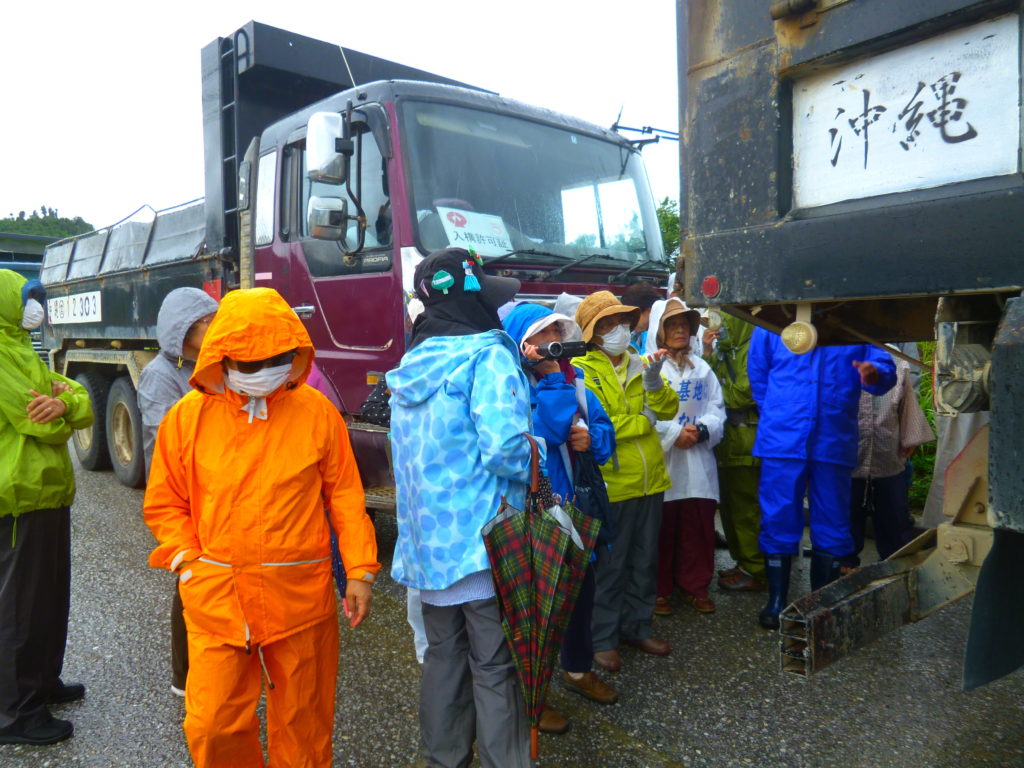 午前7時から始まったトラックによる搬入は、数台が入った後、駆け付けた本部島ぐるみの人たちを中心にした抗議の人たちによって4時間近く止められたままだという。私たちもすぐに抗議の輪の中に加わった。