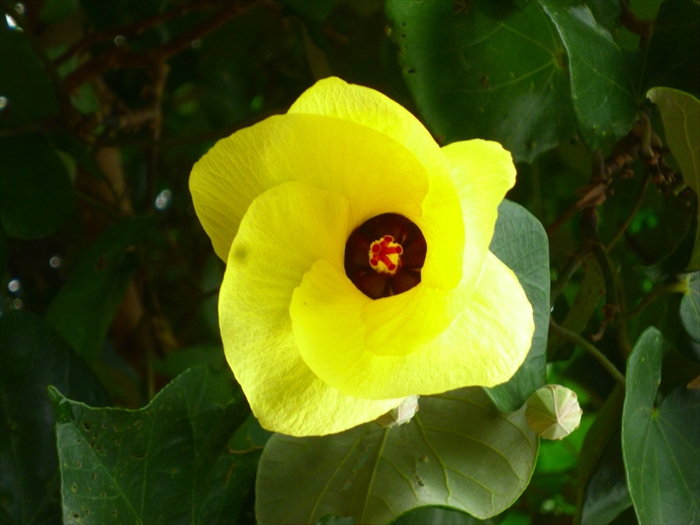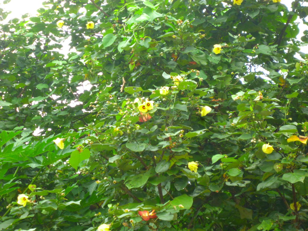 とかしくの海岸近くでゆうなの大木に出会う。一日花のゆうなの花は、朝、目が覚めるような鮮やかな黄色で開き、夕方には濃いオレンジ色に染まって、ぽとりと落ちる。
