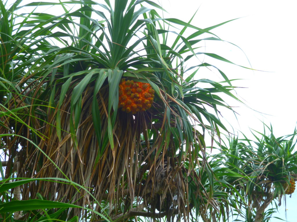 紅く熟れたアダンの実に「パイナップル?」「食べられる?」と、興味津々。