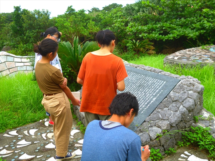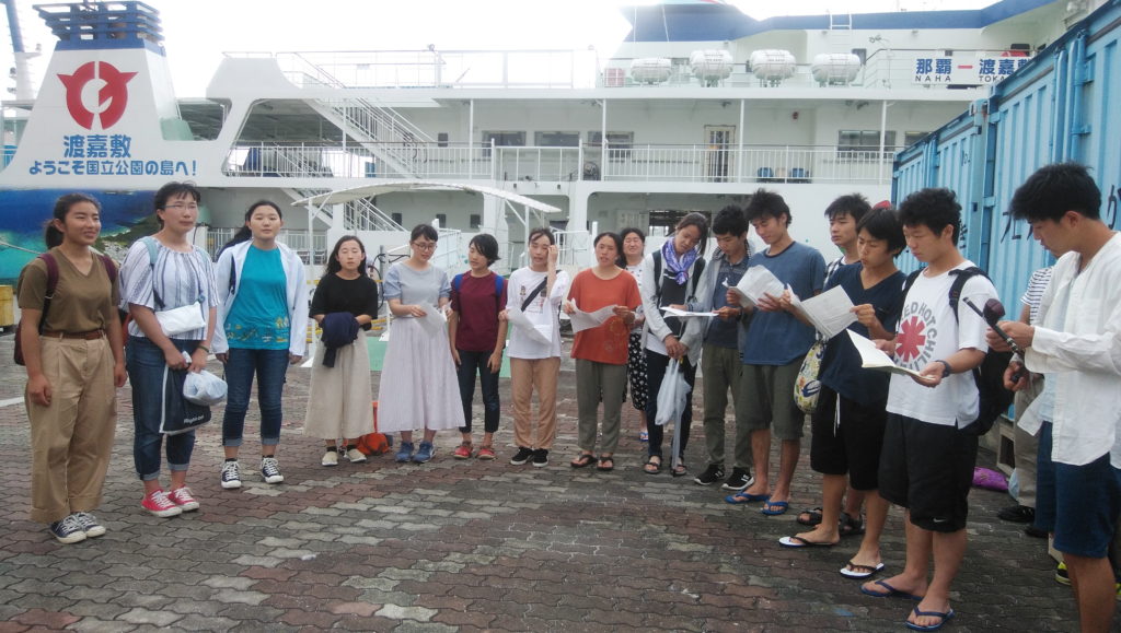 夕方、フェリーで戻ってきた泊港の船着き場で、「未来を担う責任のある者として、平和をつくるために自分は何ができるのか、これからも学び続けたい」と力強く語り、案内のお礼にと、見事な四部合唱で「島唄」を三線の伴奏付きで唄ってくれた。
