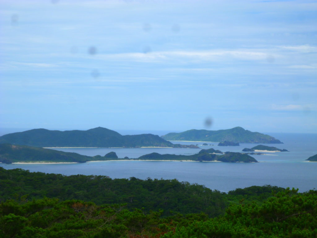 北山(ニシヤマ)展望台から望むケラマ海峡。74年前、戦は海の向こうからやってきた。この島々で起こった「集団自決」「慰安婦」という沖縄戦を特徴づける悲劇の数々がなぜ起こったのか、平和の創造のためにそれを知りたいと多くの平和学習ツアーがやってくる。