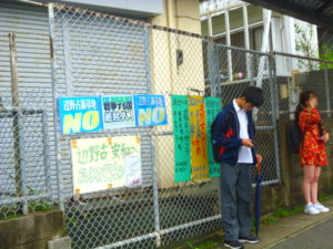 その一つのバス停、隣接する民家のフェンスに「辺野古へ行こう!」「新基地建設NO」のメッセージボードがずらり!