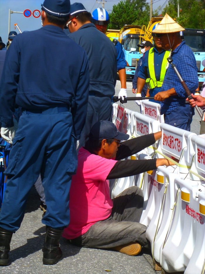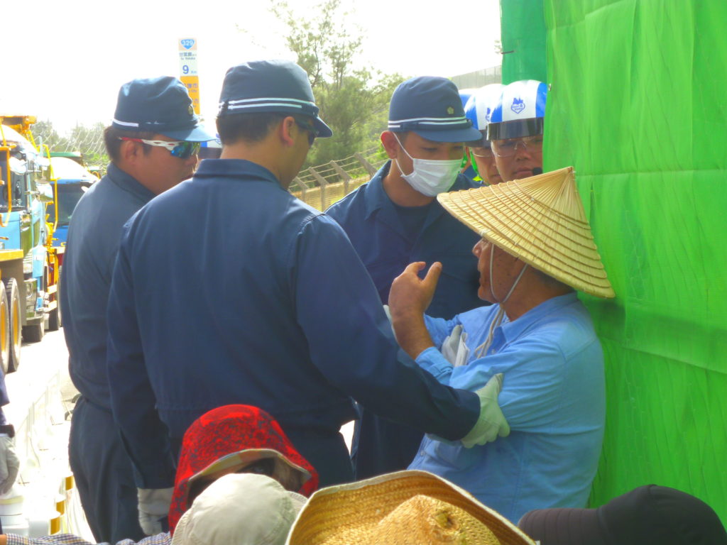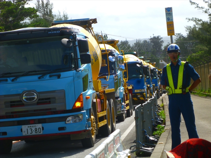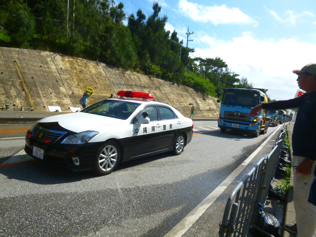 新基地建設の工事車両を先導してくるのは県警のパトカー。一民間企業の車両の運行をスムーズにするために、毎日パトカーがお出ましになる。こんなことがあっていいのだろうか?これが彼らの仕事か?