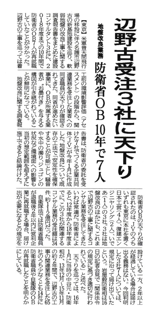 この数字は退職2年以降の再就職者は含まれていない、ということは、これら辺野古工事受注業者に、どれだけの防衛省OBが天下っているか、実態はもっとひどいということになる。これでは辺野古の工事が止まるわけがない。彼らにとって、国民のわずか1%にも満たない沖縄の民意などそよ吹く風でしかないのだろう。