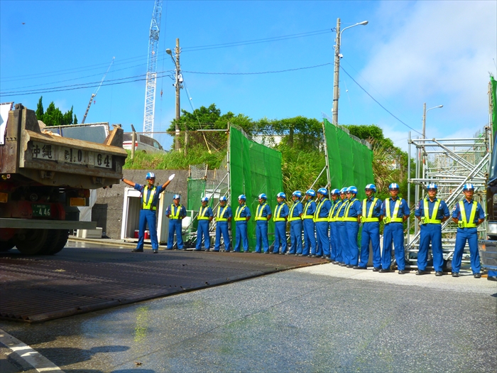 辺野古新基地建設の建設費は、警備費だけで一日2.000万円(防衛省試算)だそうだ。写真はキャンプ・シュワブ工事用ゲートの民間警備会社のガードマン。ゲートの右側だけで17名、左側にほぼ同じ人数がいて、さらに30分おきに交代する人数が同じ数。加えて昼夜3交代のはずである。