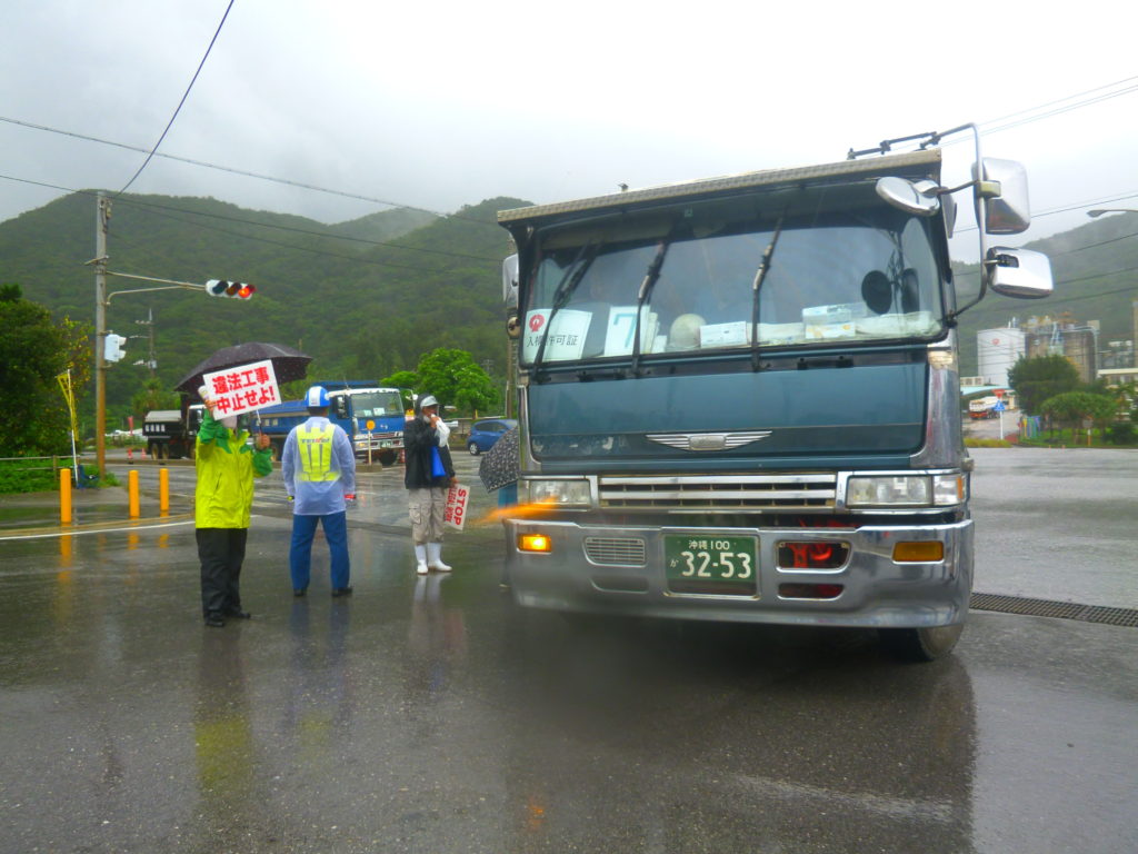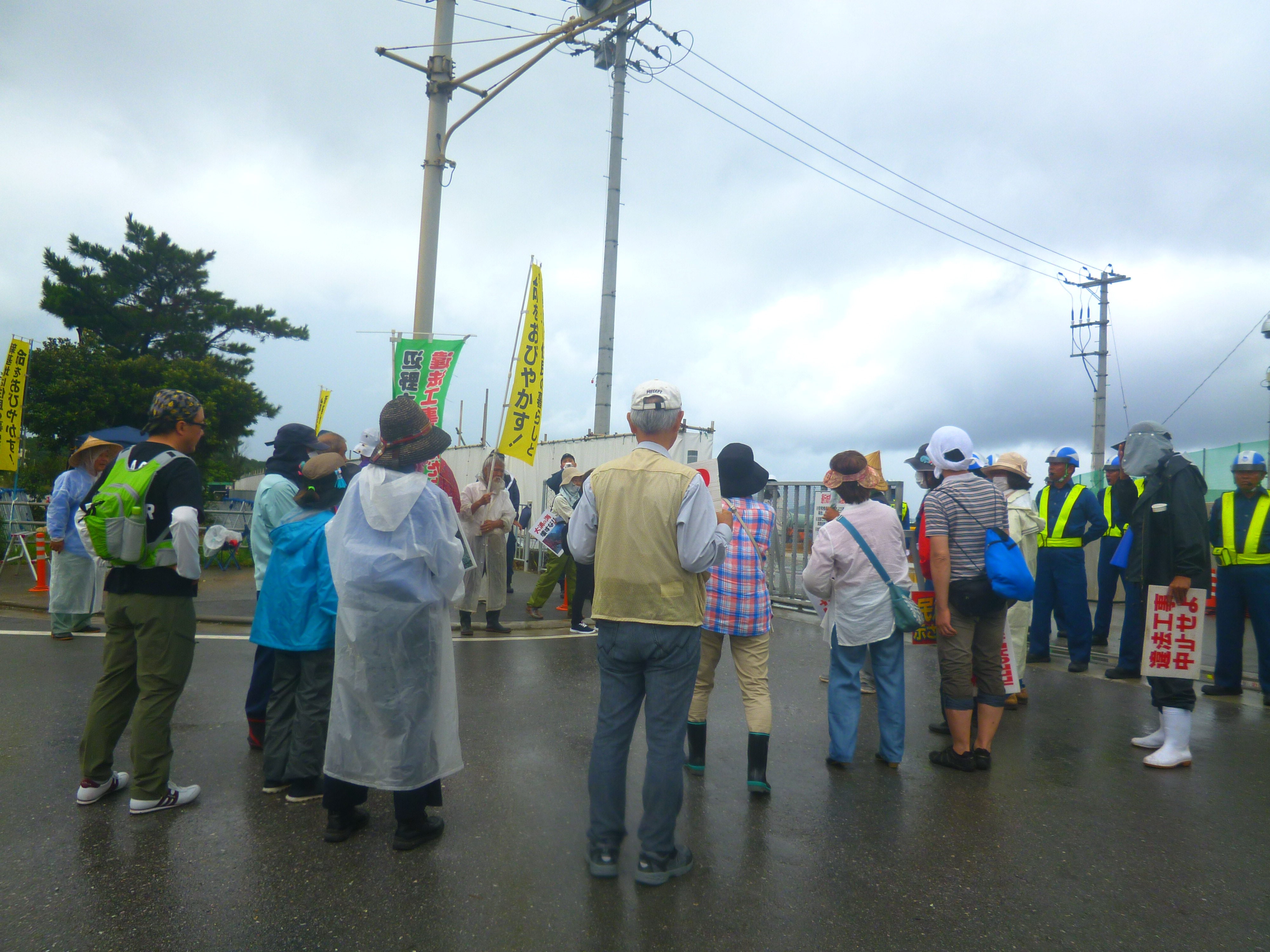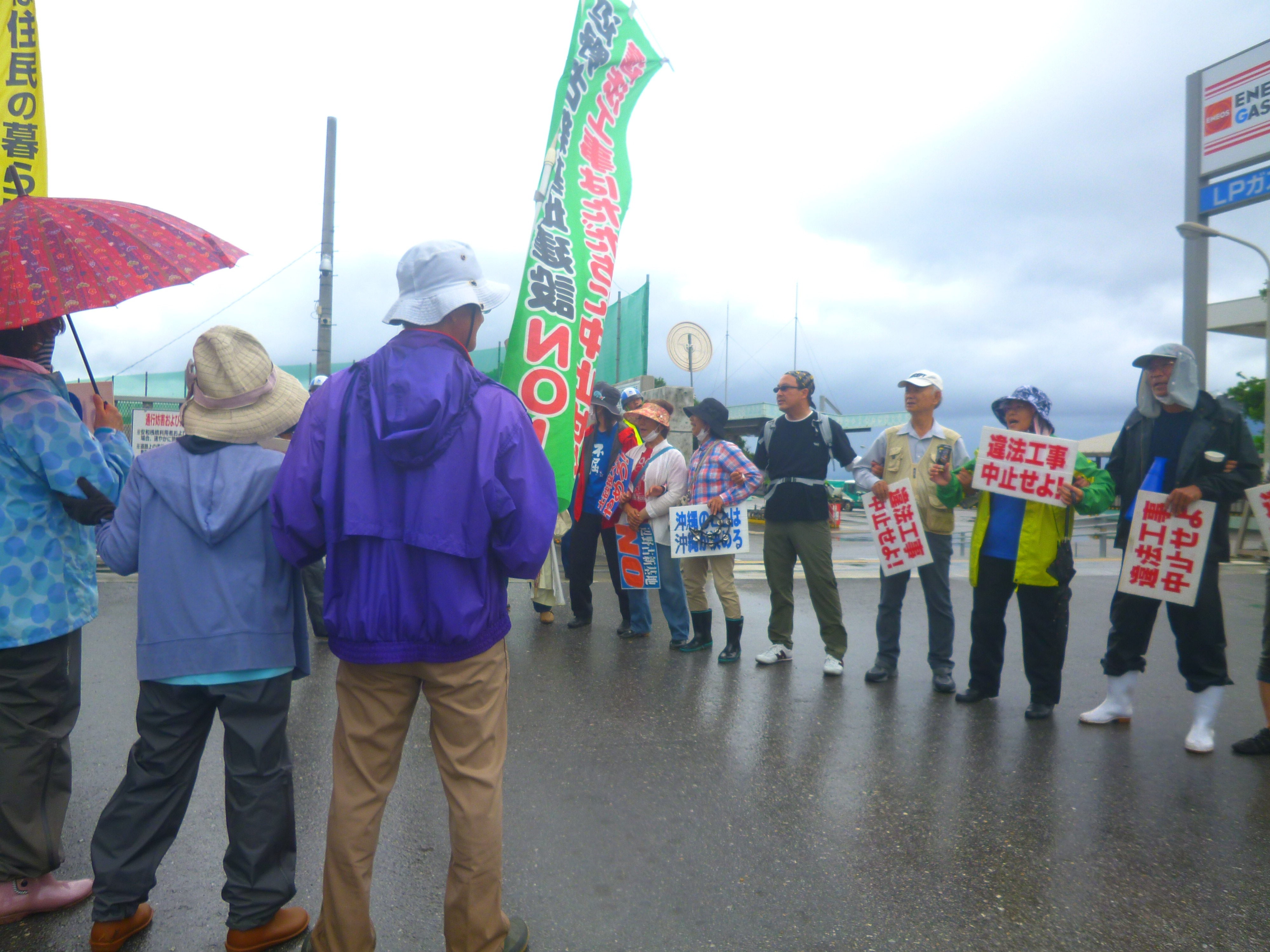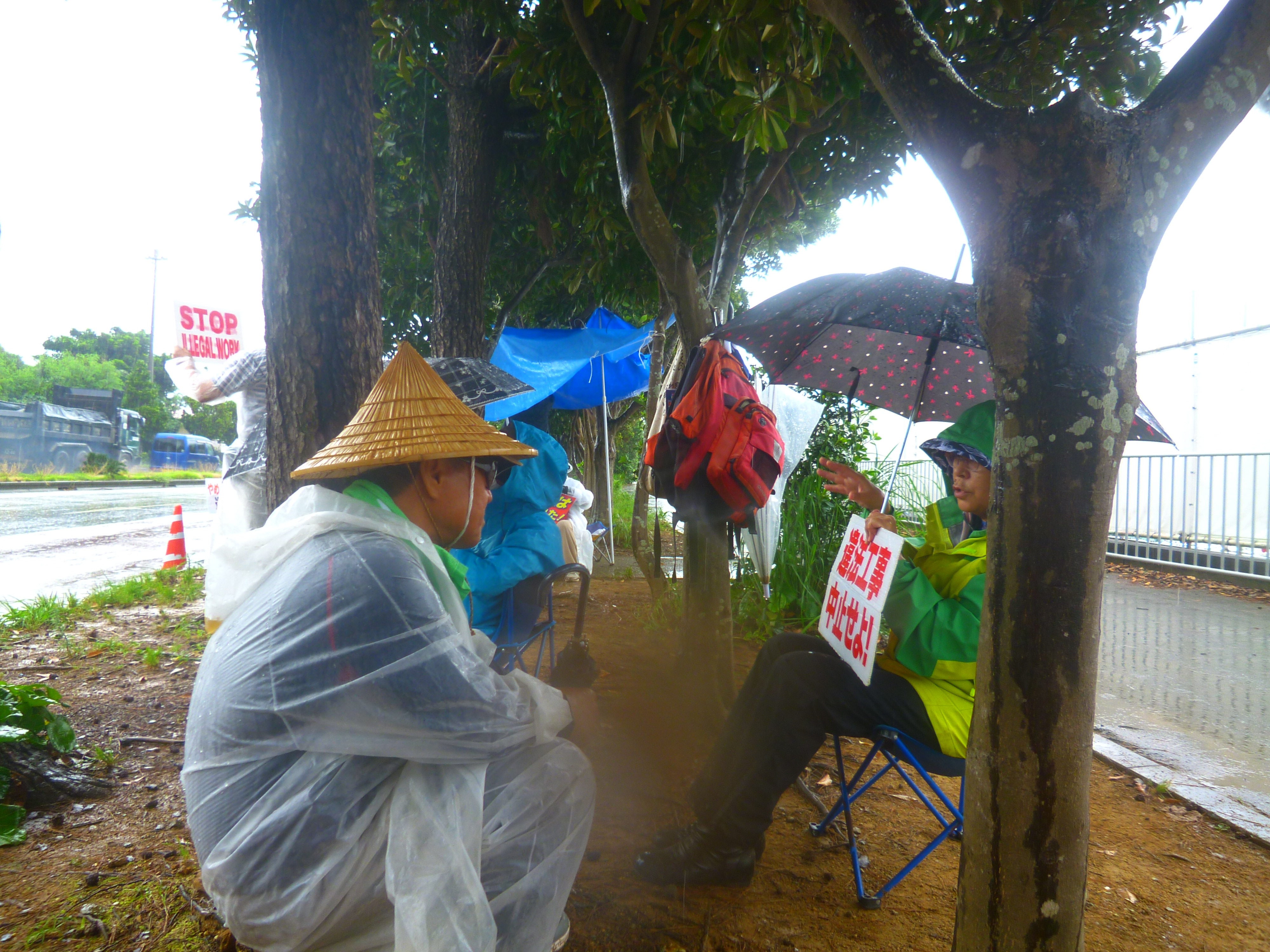 昼食の途中から傘をさしても防げないほどの土砂降りと激しいカミナリに見舞われる。「本島北部に大雨・雷警報が出た。危険なので作業を中止する。抗議行動もやめるように」と県警から要請が入る。ずぶぬれになりながら片付けを済ませ、13:30安和を離れた。