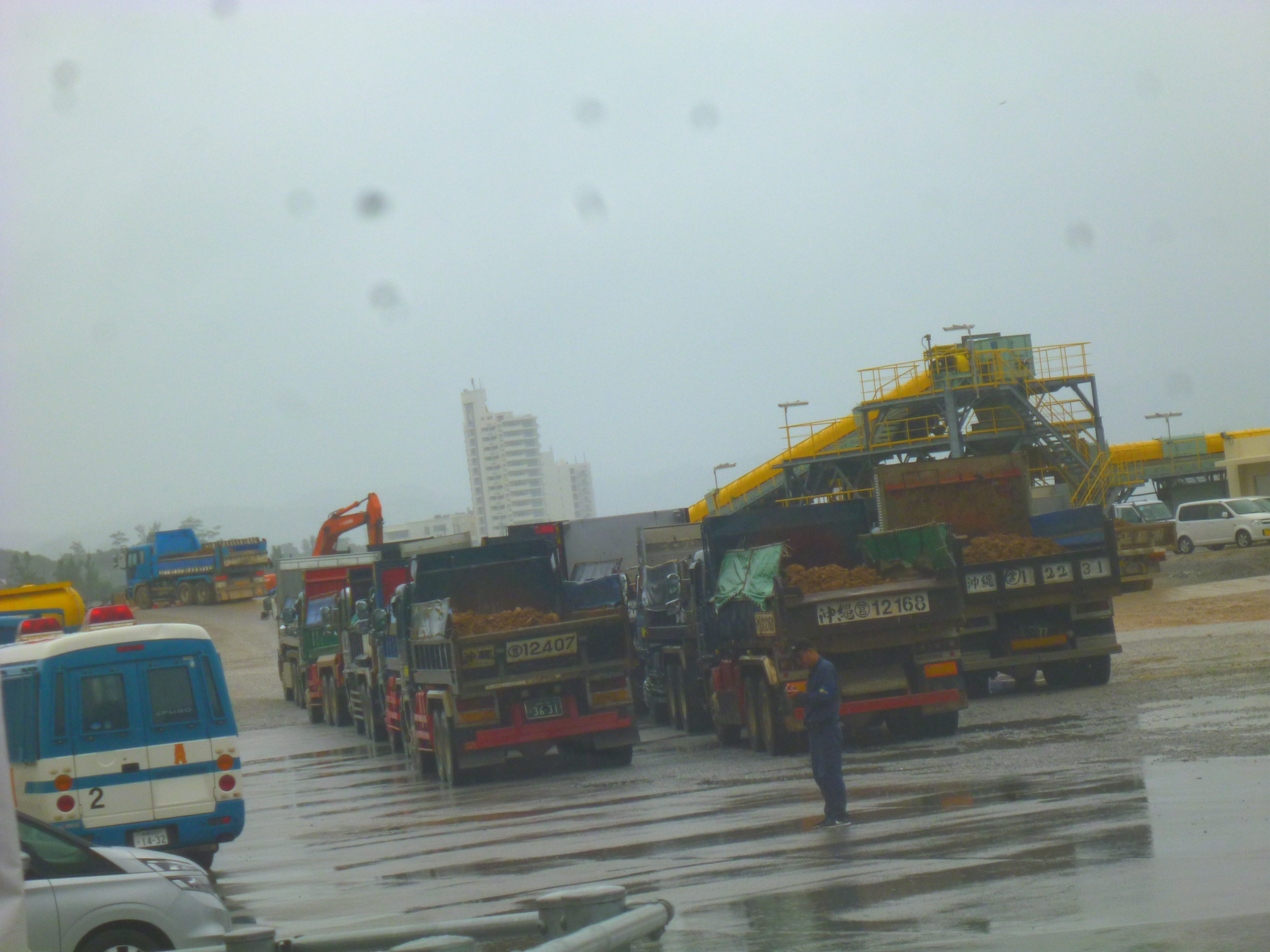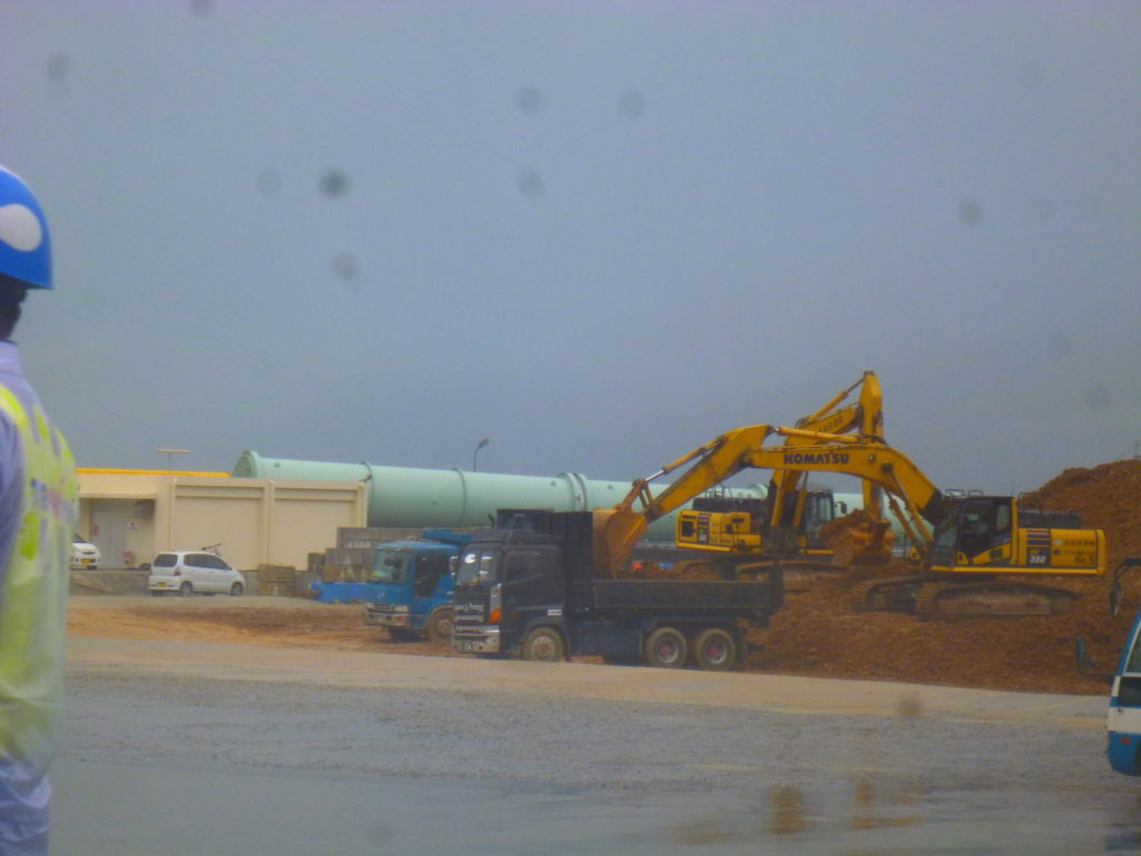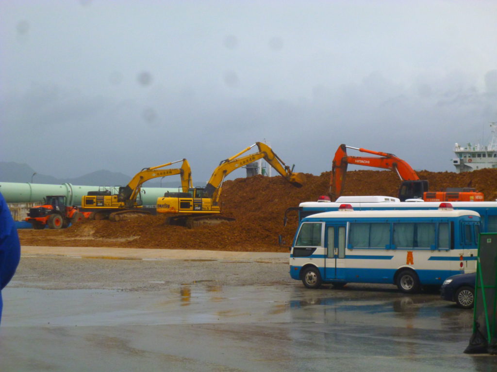 8:30、安和桟橋に到着。ゲートから入るダンプはいつもより極端に少ないが、桟橋構内に山積みされた赤土が、警察車両に守られて、ピストン運航でベルトコンベアーへと運ばれている。