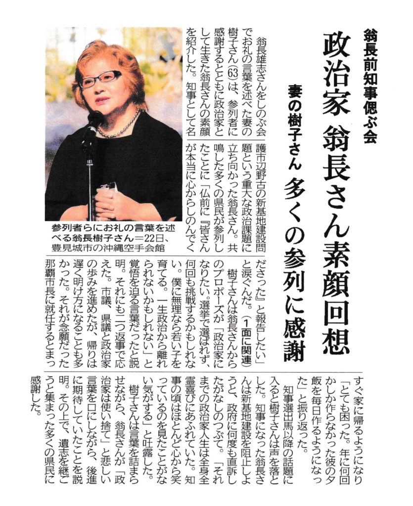 セレモニーで感謝の辞を述べた妻・幹子さんは家庭での翁長さんの素顔を語るとともに、知事に就任してからの翁長さんの苦悩が並大抵のものではなかったことを改めて明らかにした。