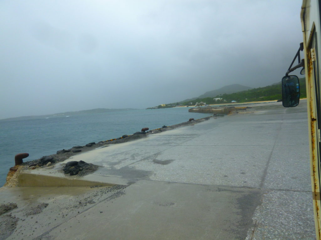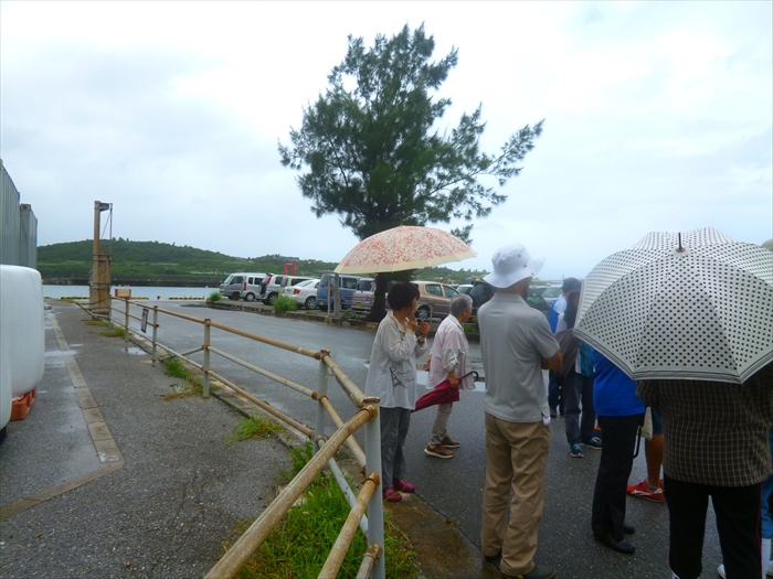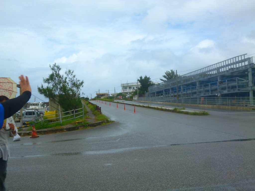 一通りの台風対策を終え、11時過ぎバスは辺野古を離れたが、辺野古へ着いてまだ1時間しかたっていない。今朝のバスには県外からの若者が1人乗っていたので、彼のためにも先日「米軍に民間港を使わせない」として、市民と労働組合がスクラムを組み米軍車両を追い返した本部港に行くことに。