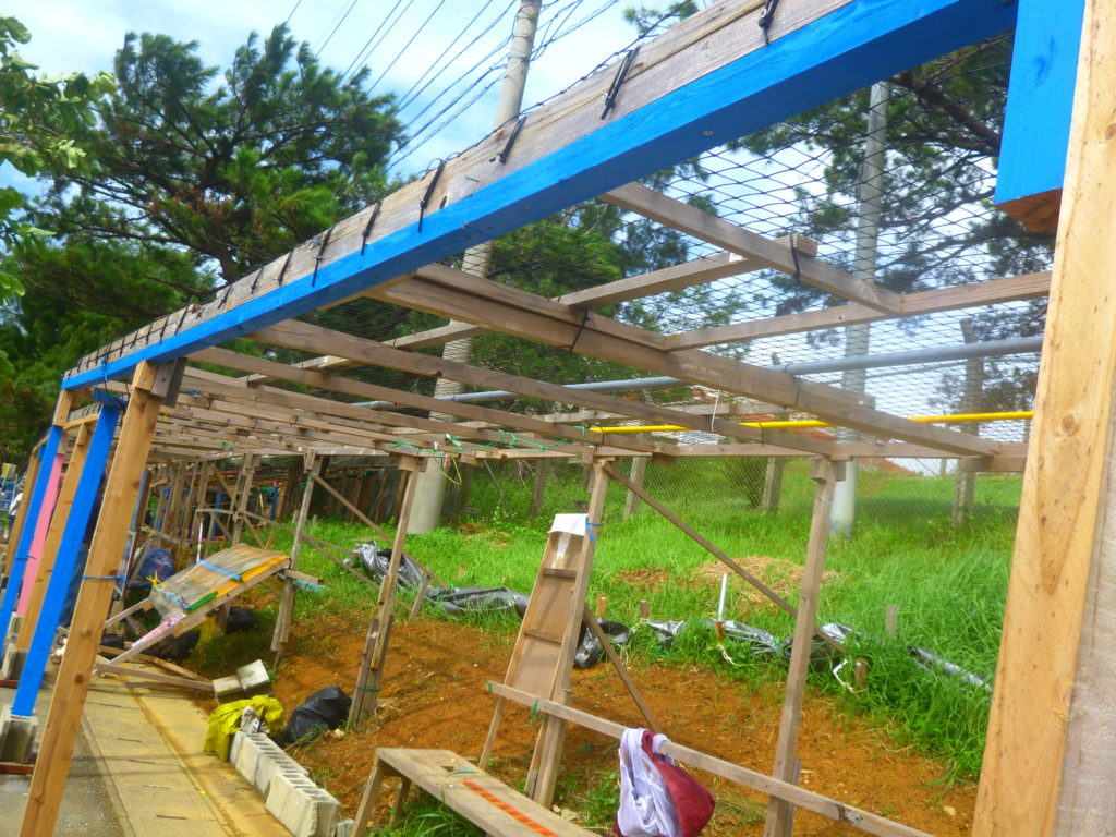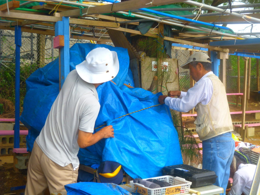 みんなで力を合わせて、屋根カバーをたくし上げ、風で飛ばされないよう支柱に縛り着ける。
