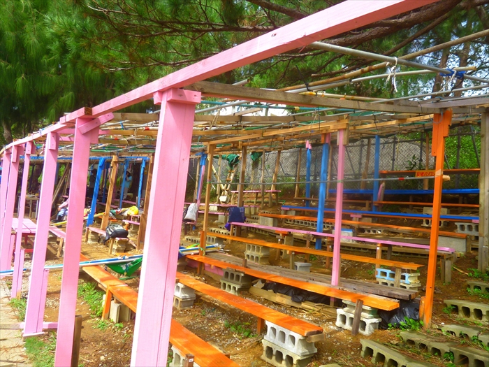 イスや机も一か所にまとめてバーをかけ、横のモクマオウの大木に括りつける。