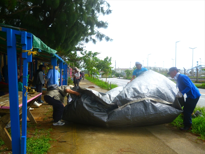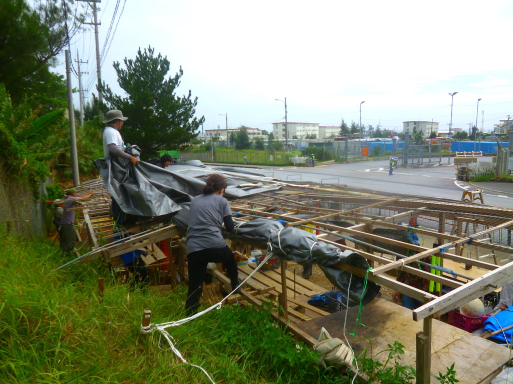 しかし、2回目以降の搬入はないとの通告があり県警の車両も帰ったので、テントの屋根のカバーをはずすなどの台風対策が始まっていた。