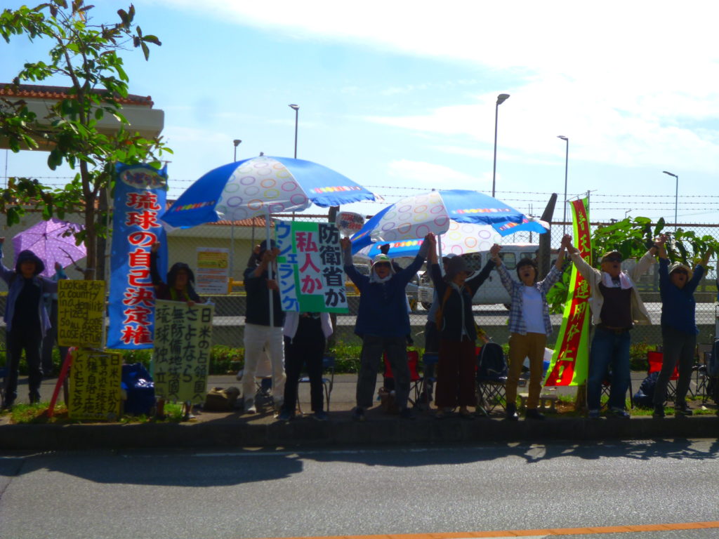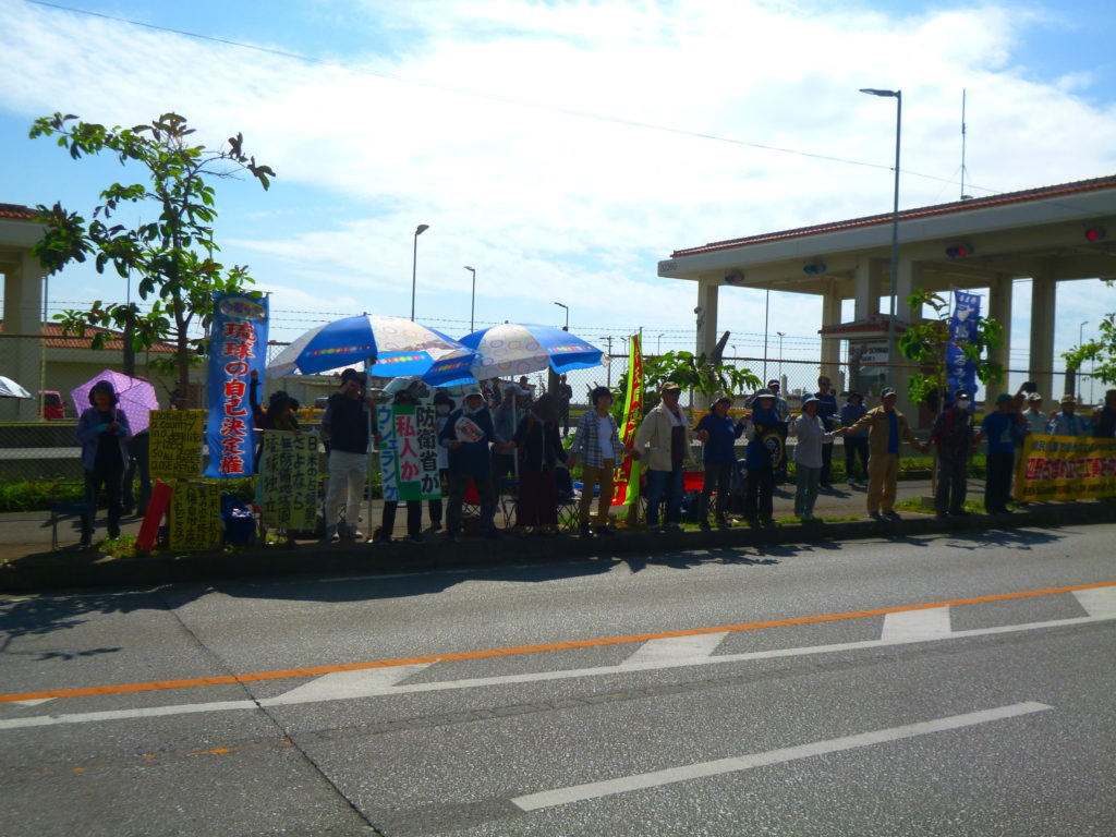 集会が始まる前に一緒に工事用ゲートに座り込んだ札幌の大学生5人が、名護市議の大城敬人さんから20数年にわたる辺野古の闘いについてレクチャーを受けていた。