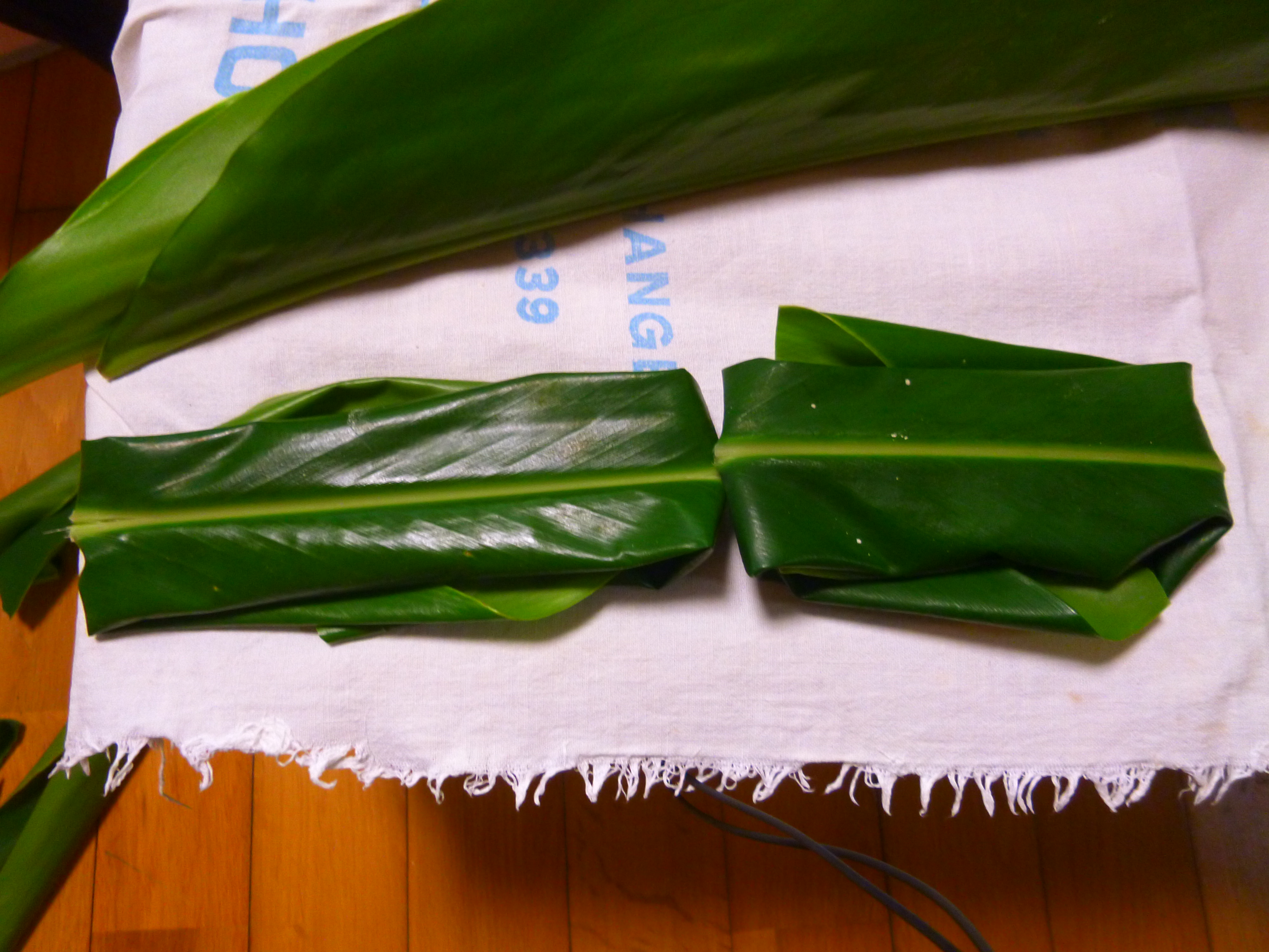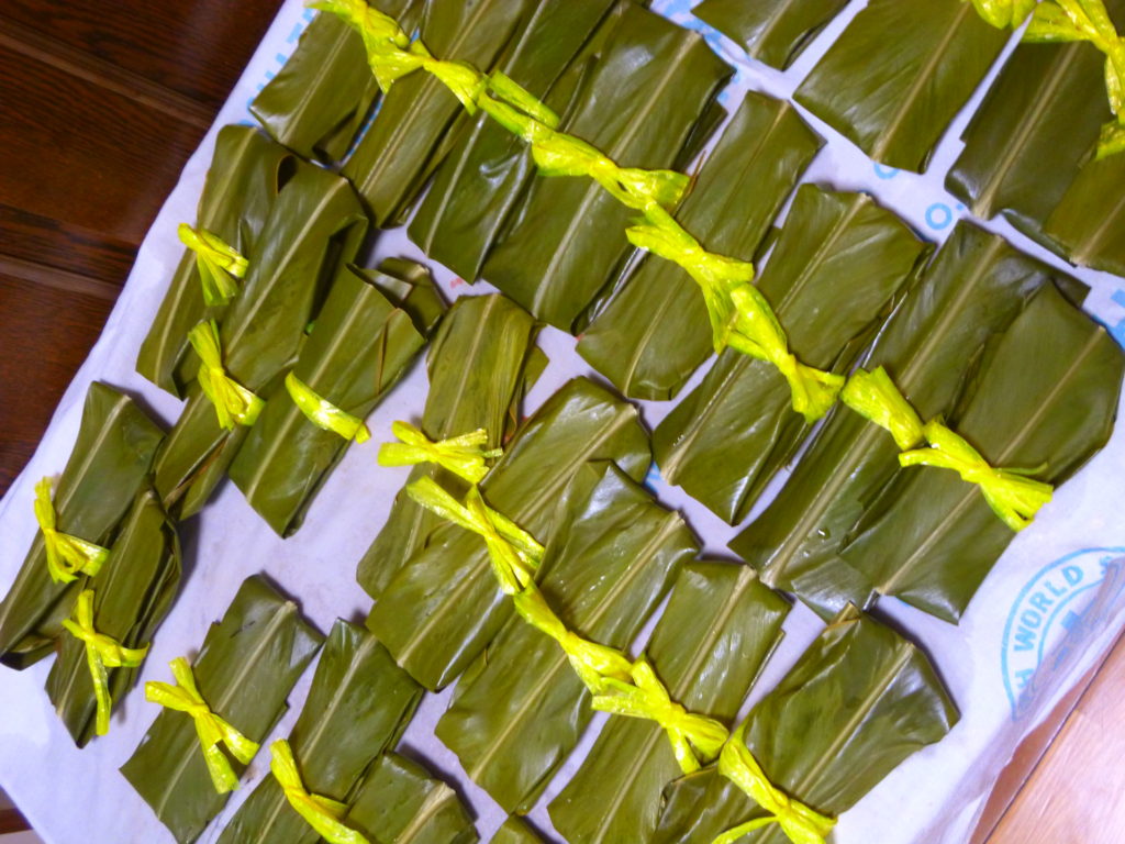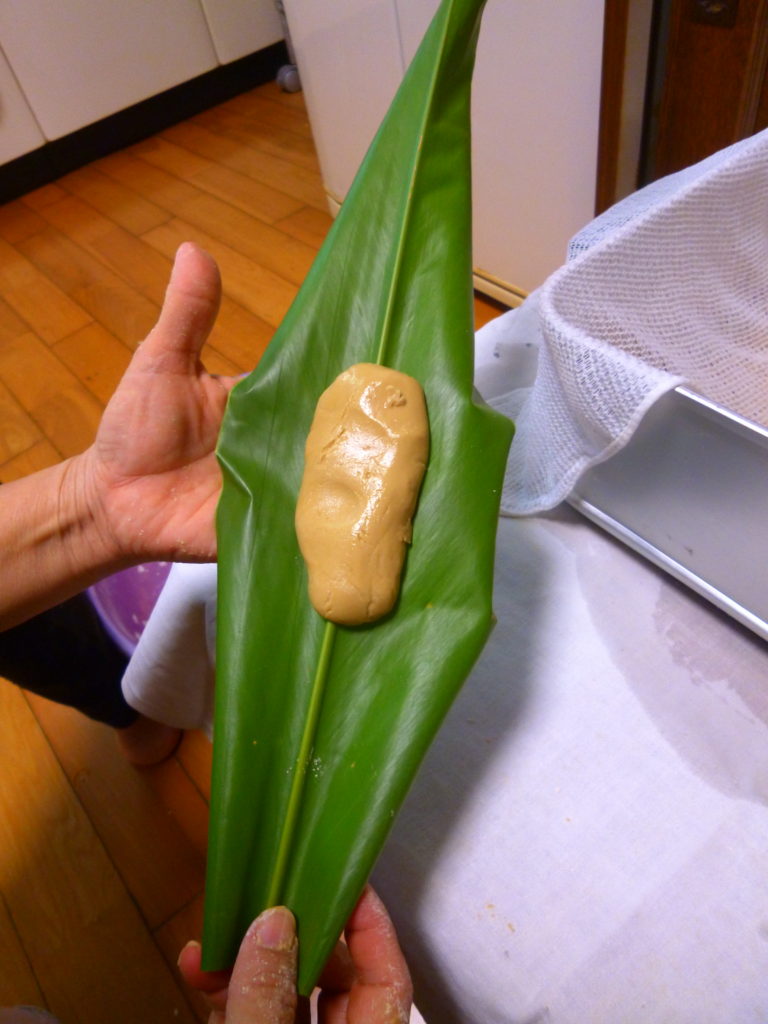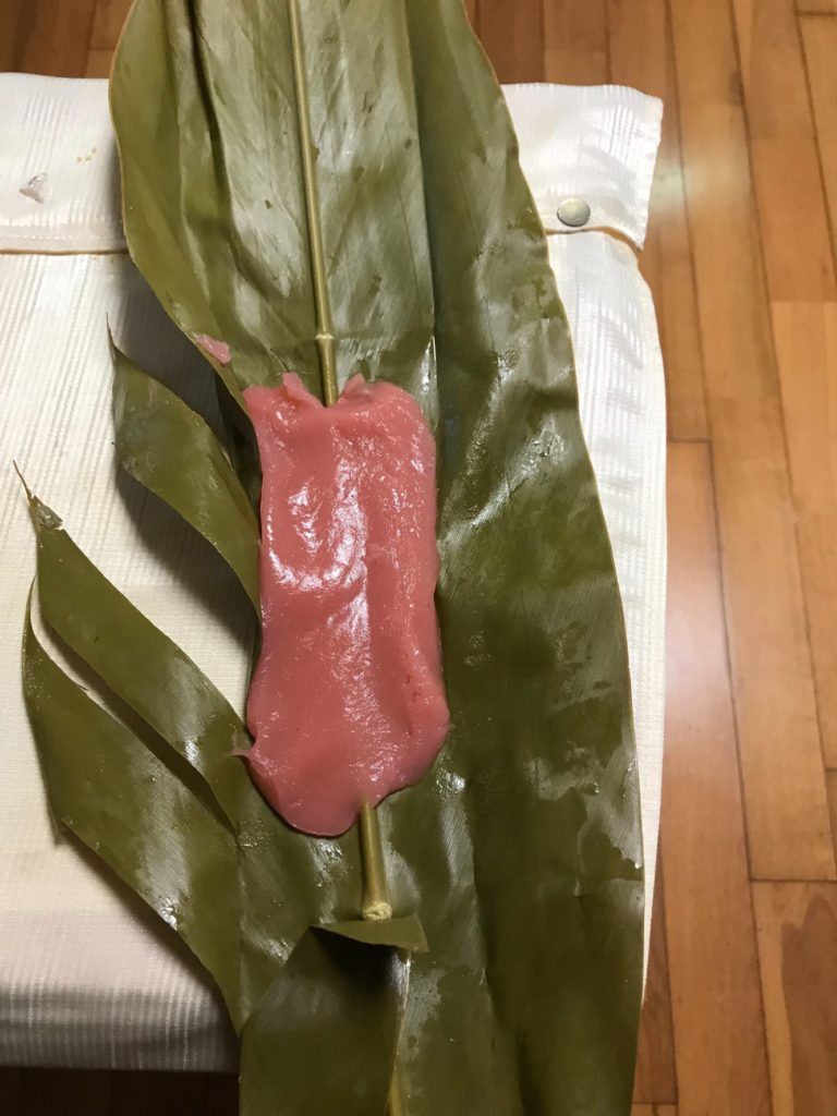 月桃の葉にお餅を包んみます。かつてはモチ米を石うすで挽き、捏ねて造ったのでしょうが、今どきは、餅粉に水を加えてこねるだけで簡単にできます。(最近ではムーチーミックスなる便利なものもあります)お餅には黒糖や、紅芋などを加え好みの味付けをします。ちなみに我が家のは黒糖味です。(私自身は、何の味付けもしない素朴な白餅が好きですが…)