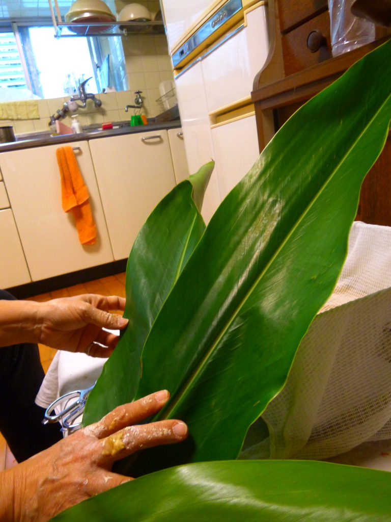 まずは、モチを包む月桃(ゲットウ)の葉をゲット(!?)するところから始まります。島は豊かな里山に恵まれていますので、いくらでも立派な自生のムーチーガーサが手に入ります。