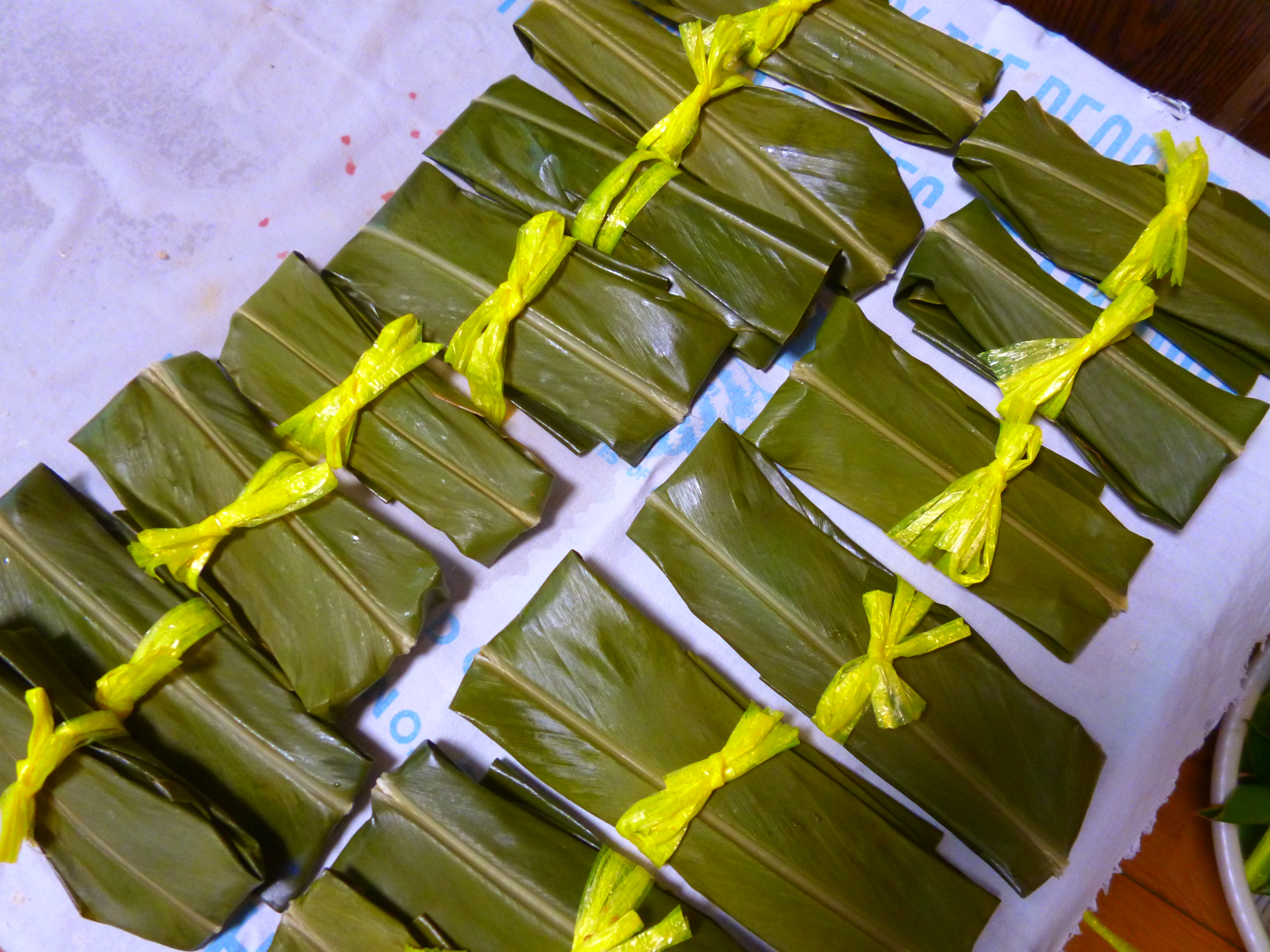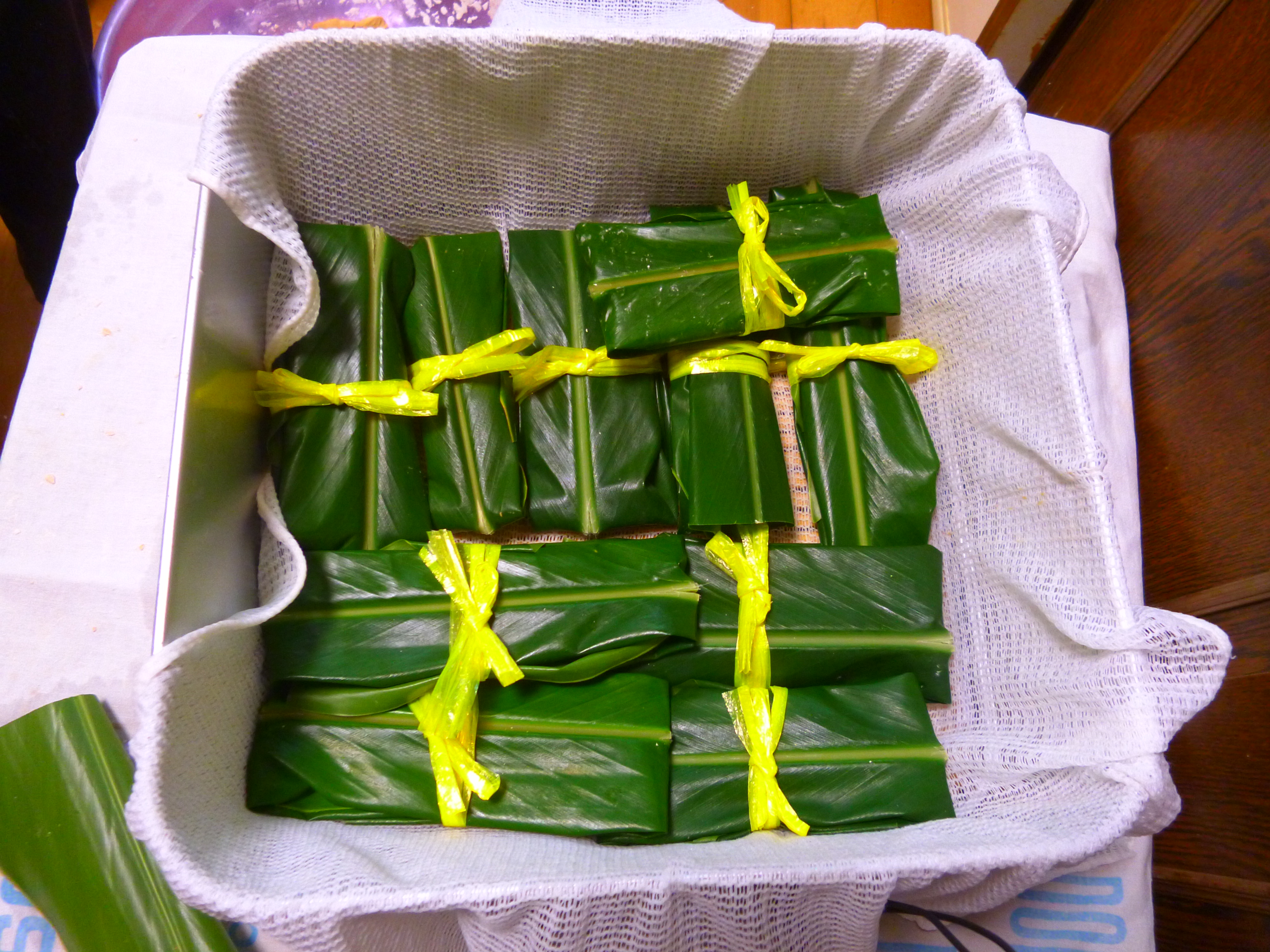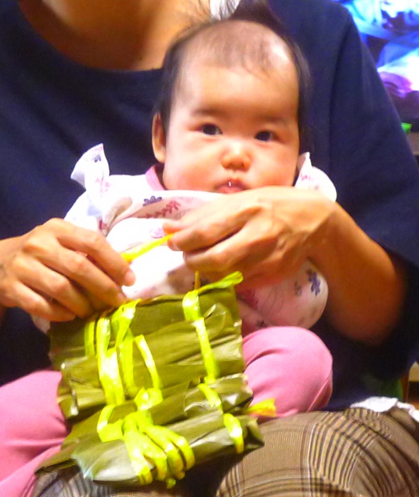 実は「ムーチーつくりました!」と大きな声で言いましたが、正直に言いますと、私がつくったのではなく、初ムーチーを迎える子どものおばぁちゃんである我が妹がつくりました。私は、黄色いひもを結んだだけです。すみません。