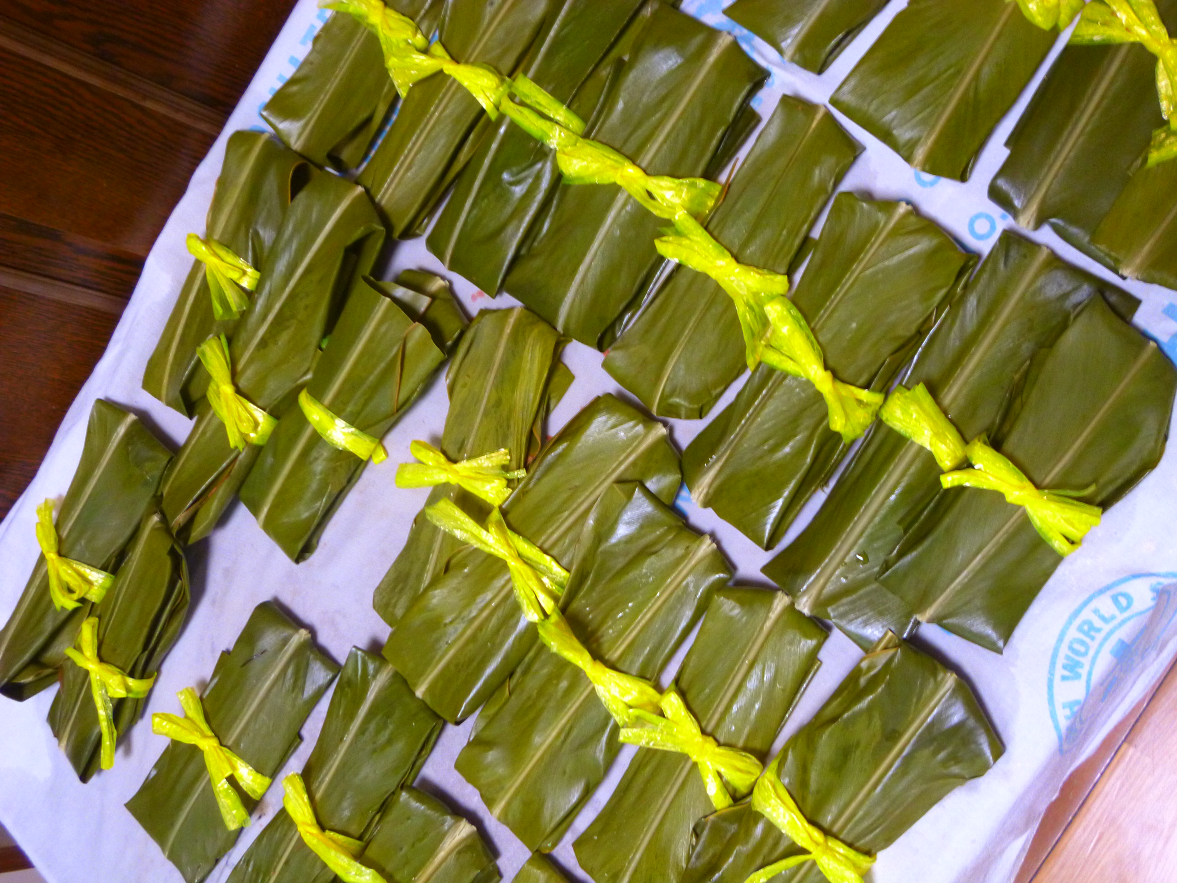 カーサがほぐれないように真ん中をひもで結んでから、蒸し器に並べて15分ほど蒸すと出来上がりです。