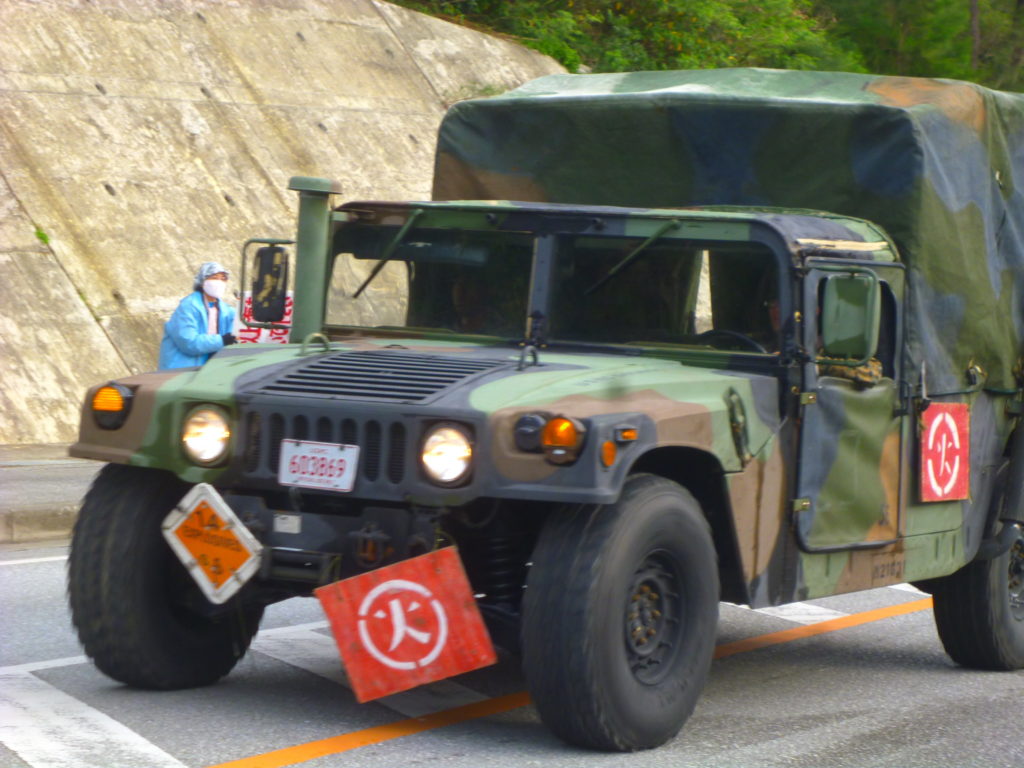 今日は、目の前を米軍車両の通行も多かった。キャンプハンセンなどで、大掛かりな訓練が行われているのだろうか!