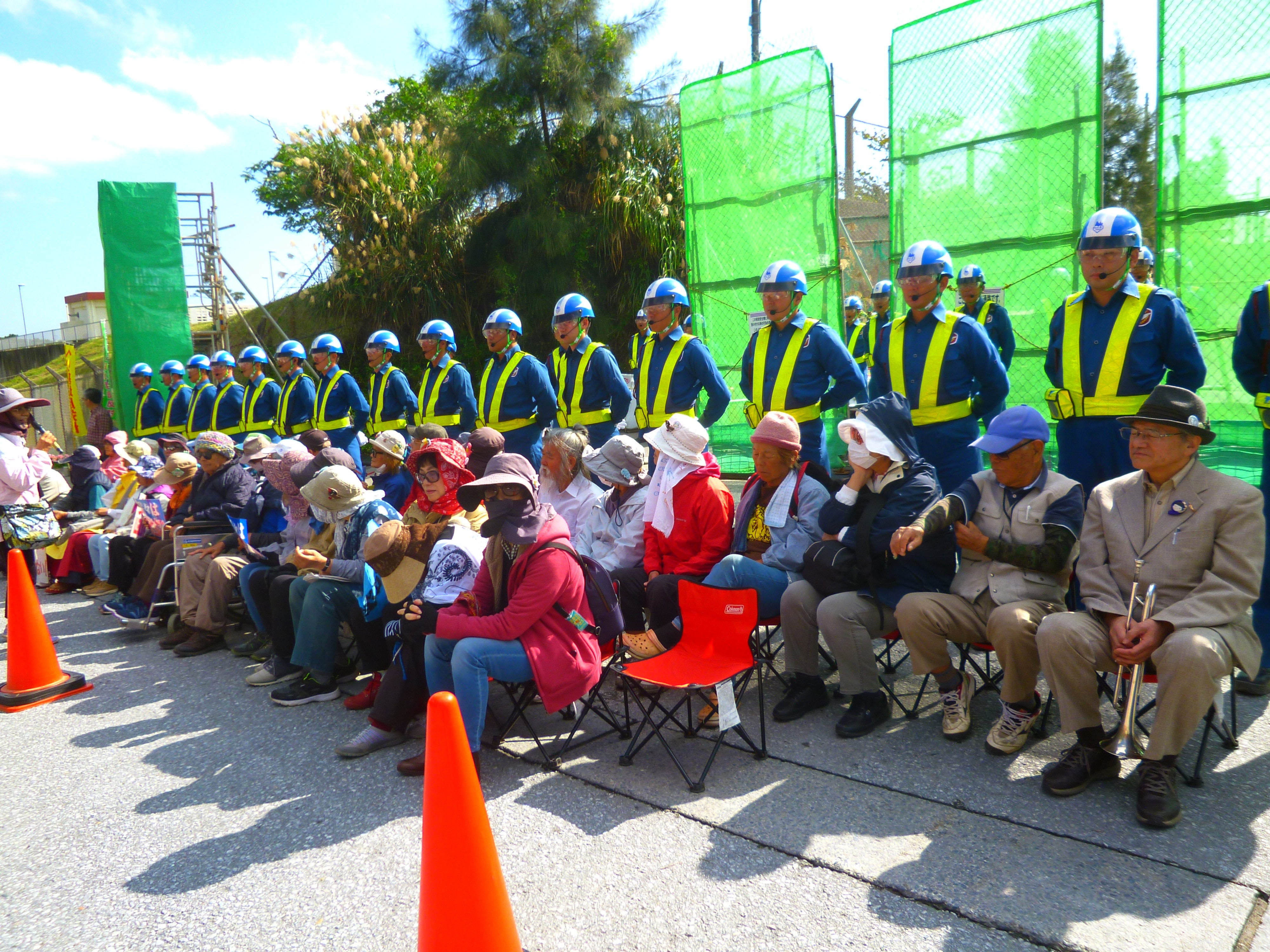 基地内から出てきた県警のパトカーが、工事車両をお迎えに向かったのを合図に私たちはゲート前に座り込む。バリロードと民間警備員に挟まれたわずかの隙間に40数名が座り込んだ。