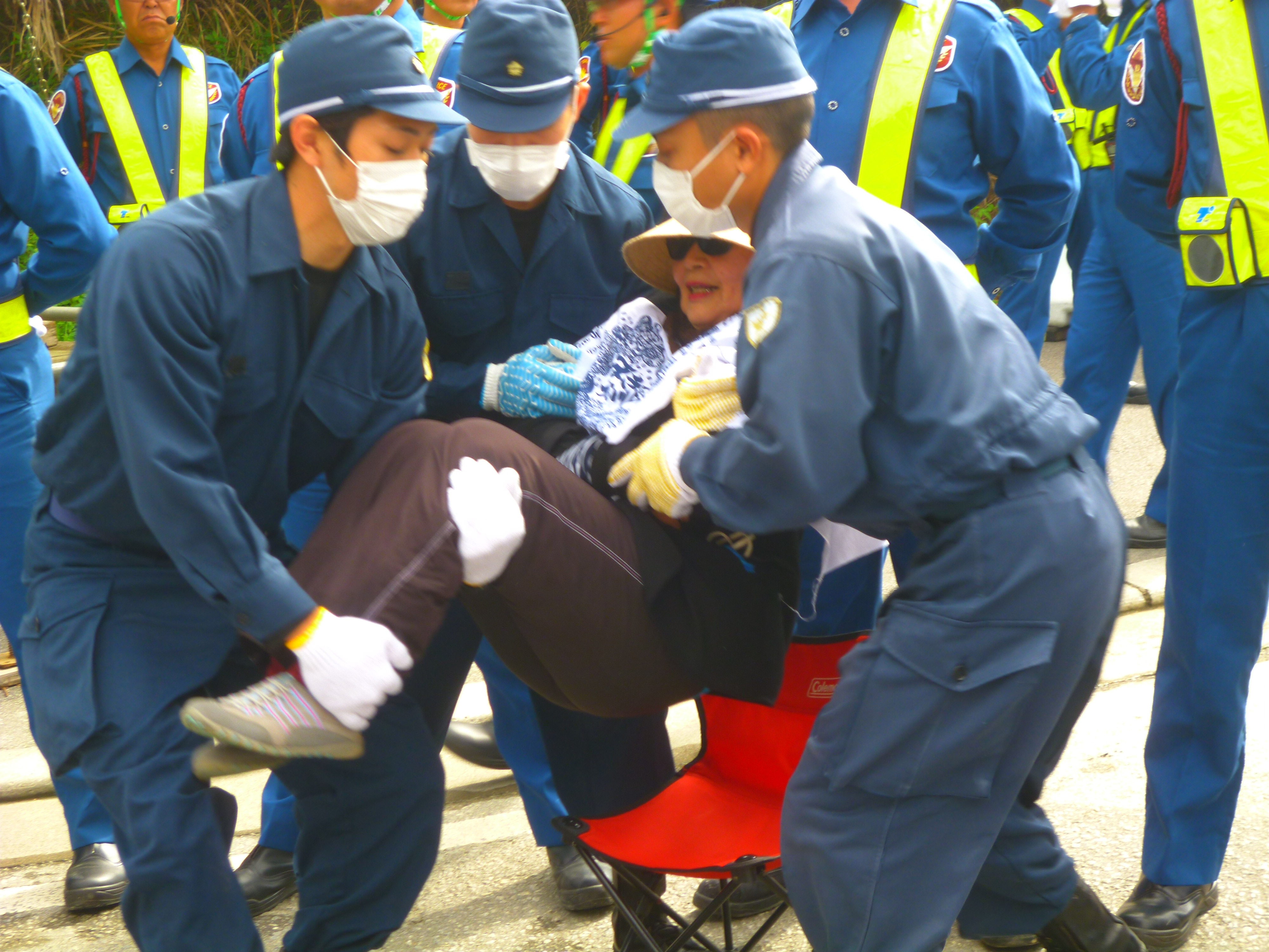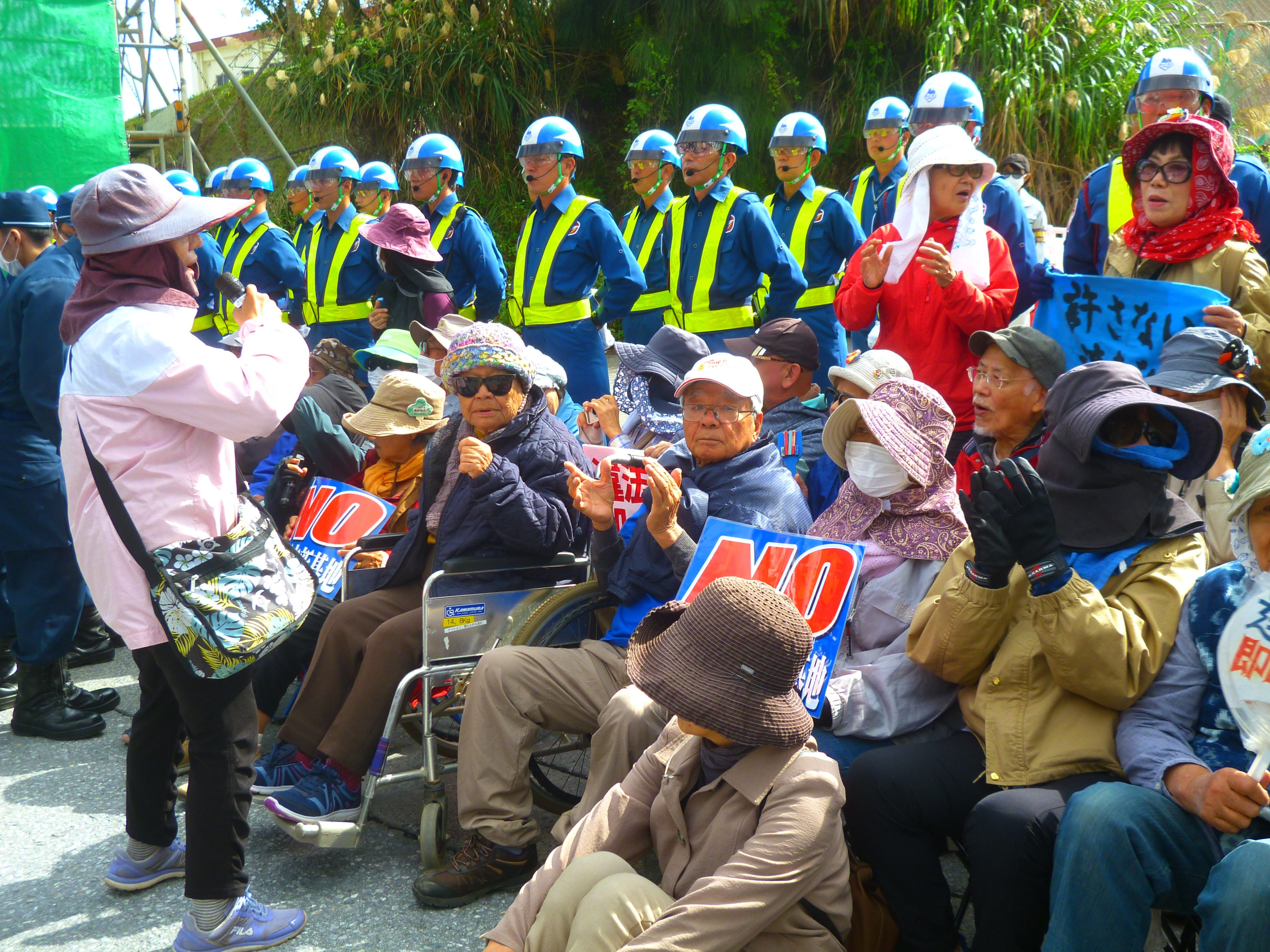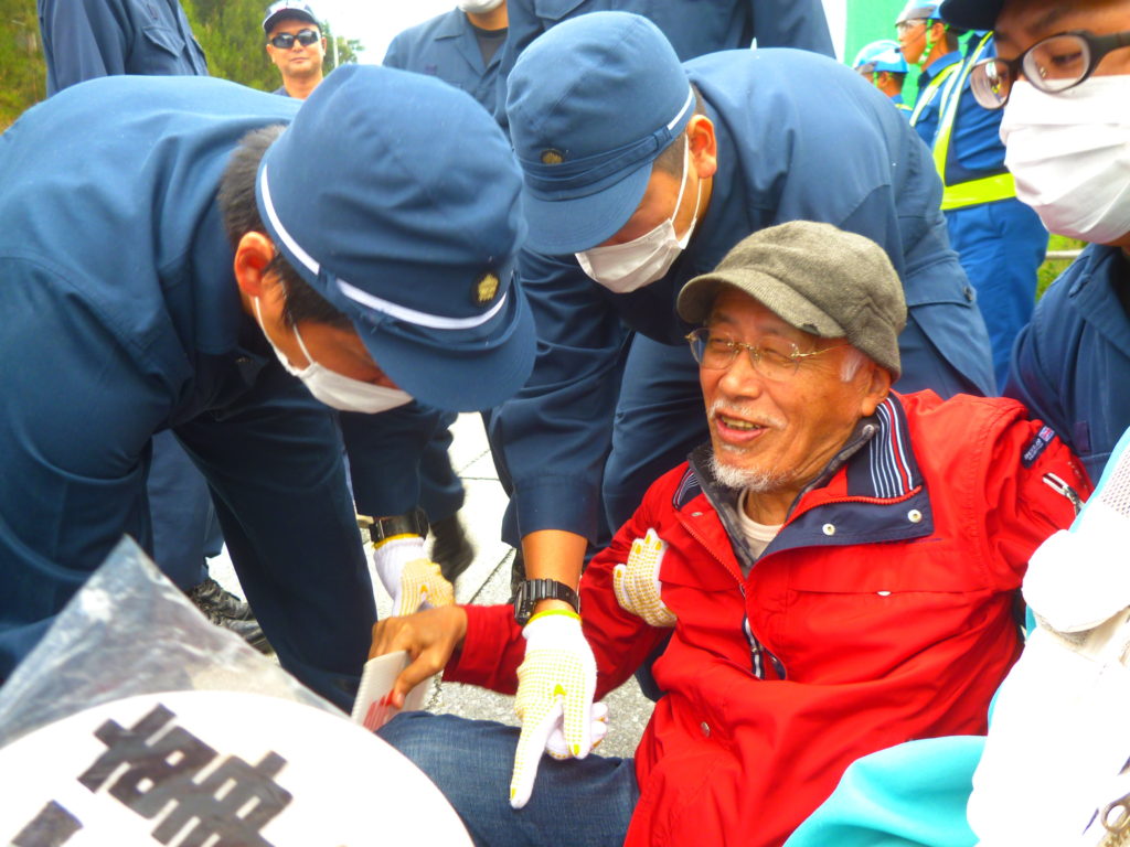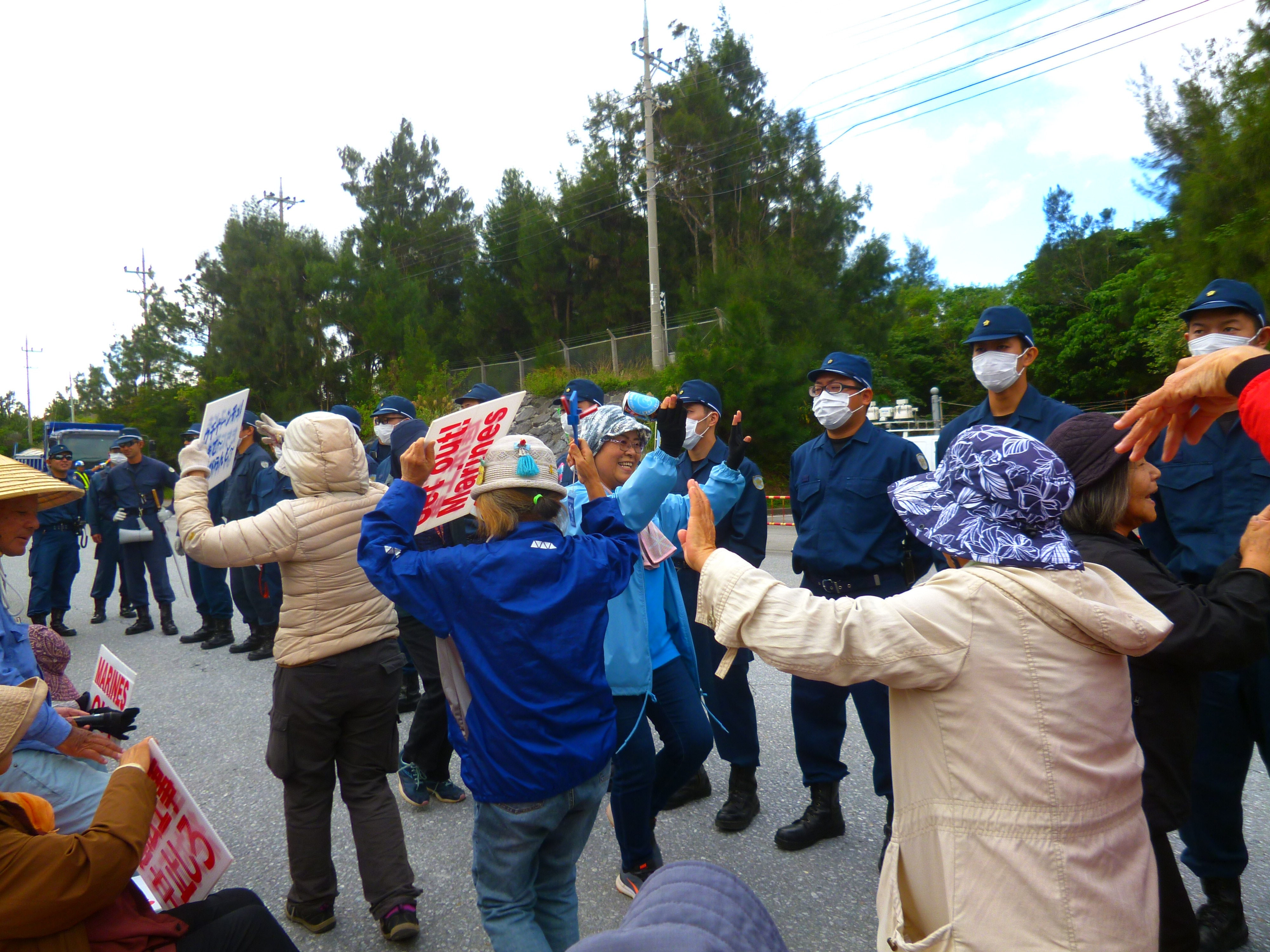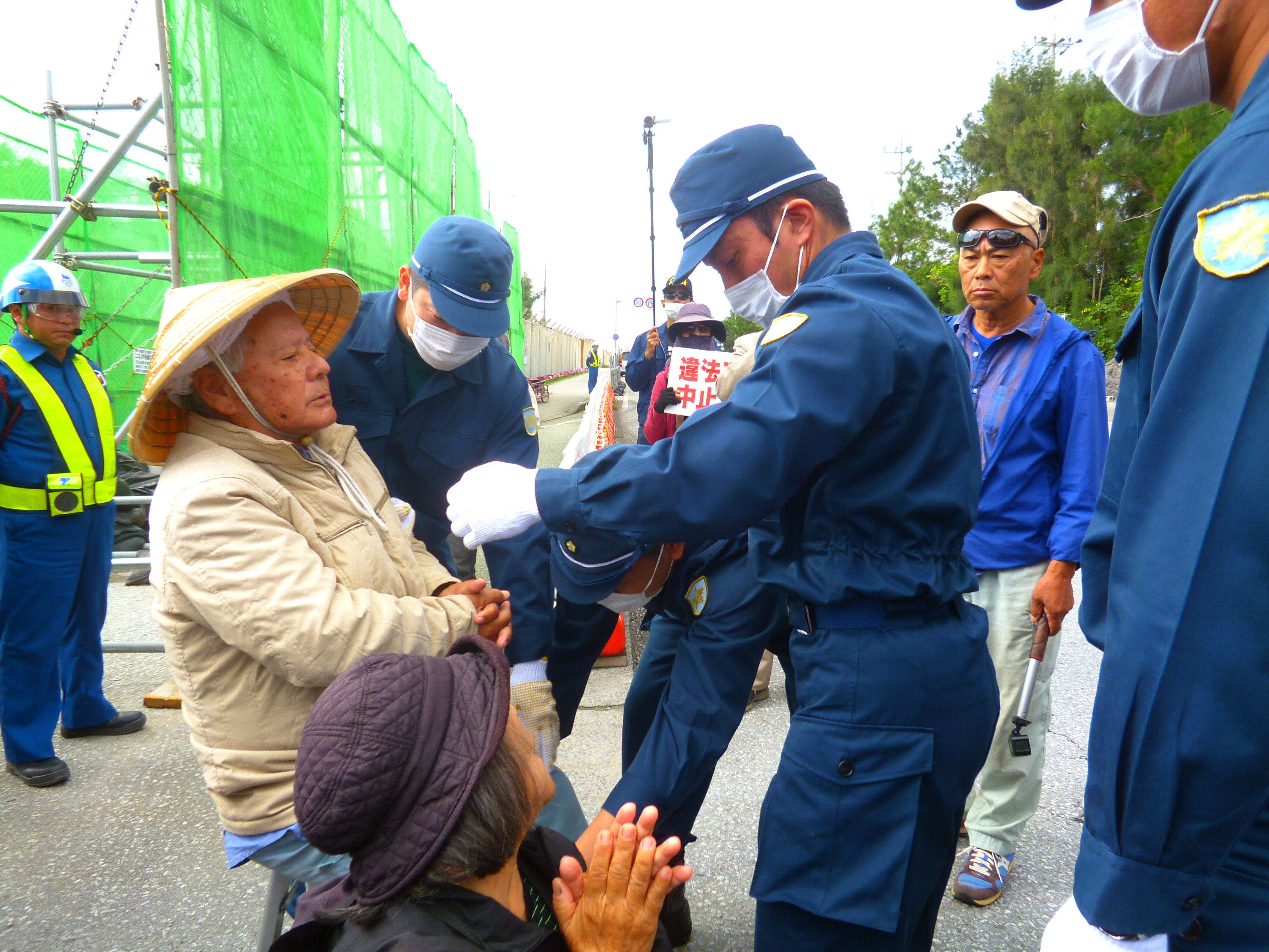 午後3時、三回目の座り込みでは、宮古島の雨乞いの民族舞踊「クイチャー」を踊りながら機動隊を制する女性たち。辺野古では雨乞いではなく「平和を乞う」祈りの踊りとなる。踊り終わるまで機動隊も手を出せない。
