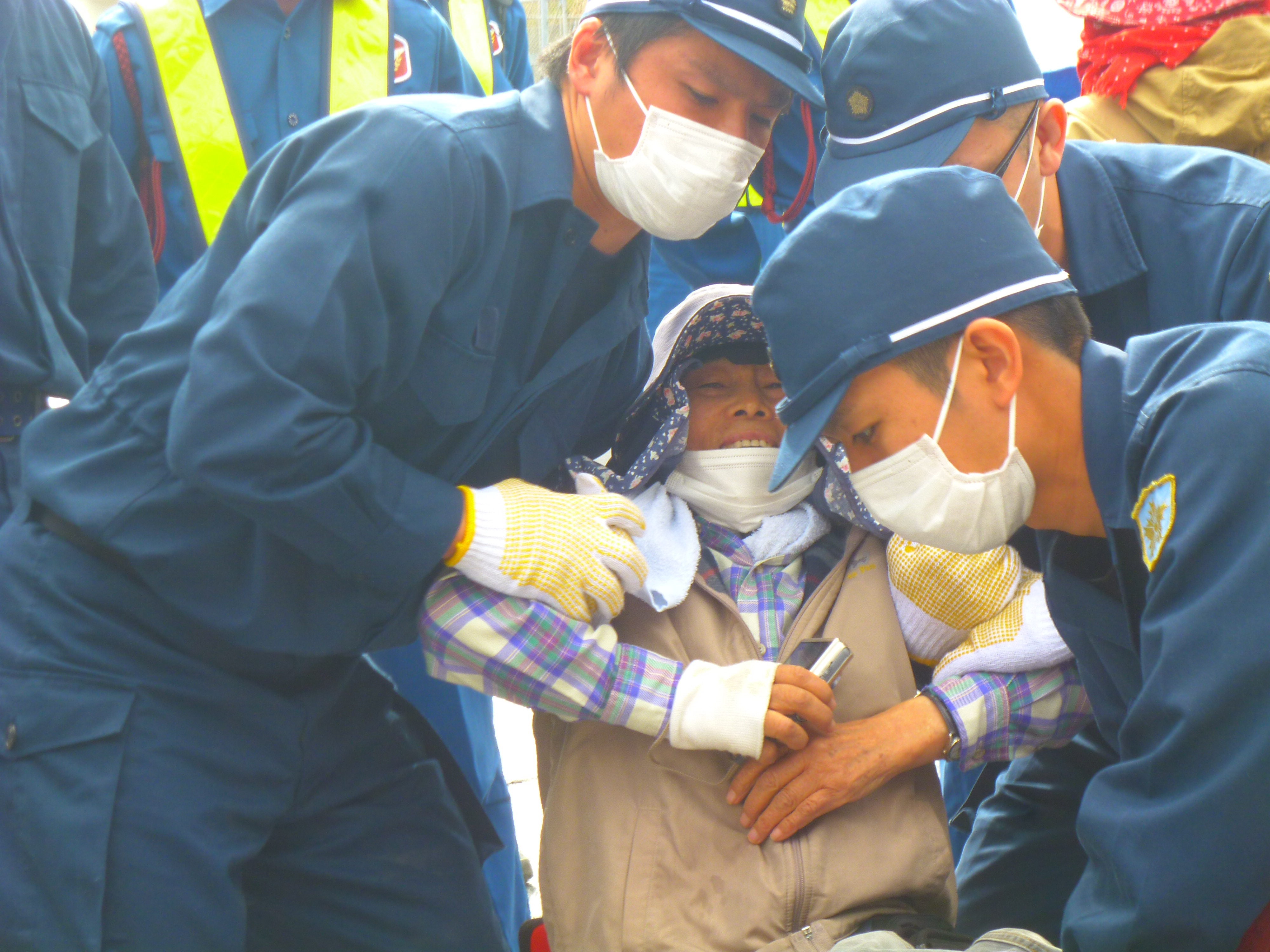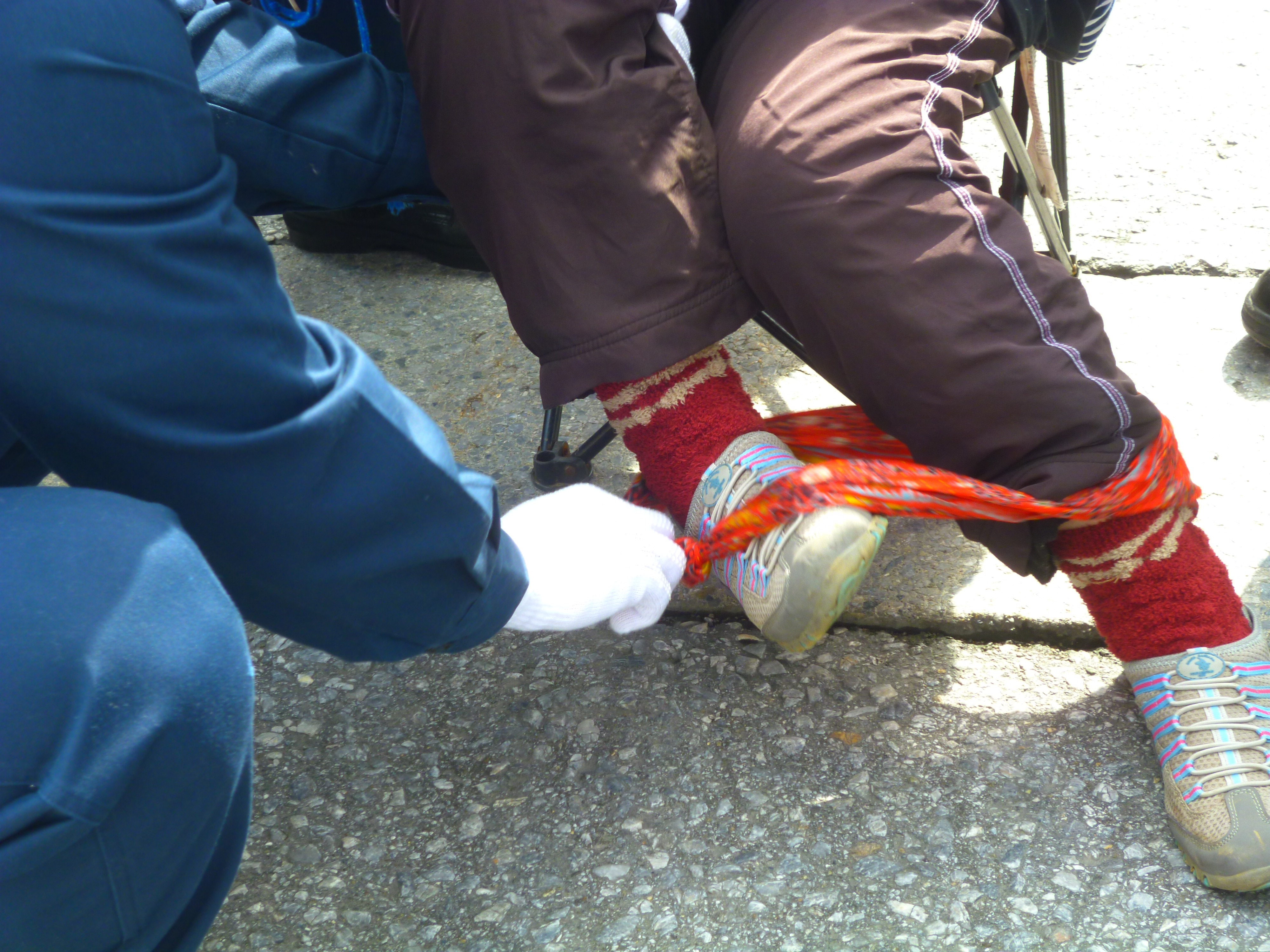 排除されるときの抵抗の仕方も、人それぞれ。足を椅子に括り付けて時間稼ぎする女性。