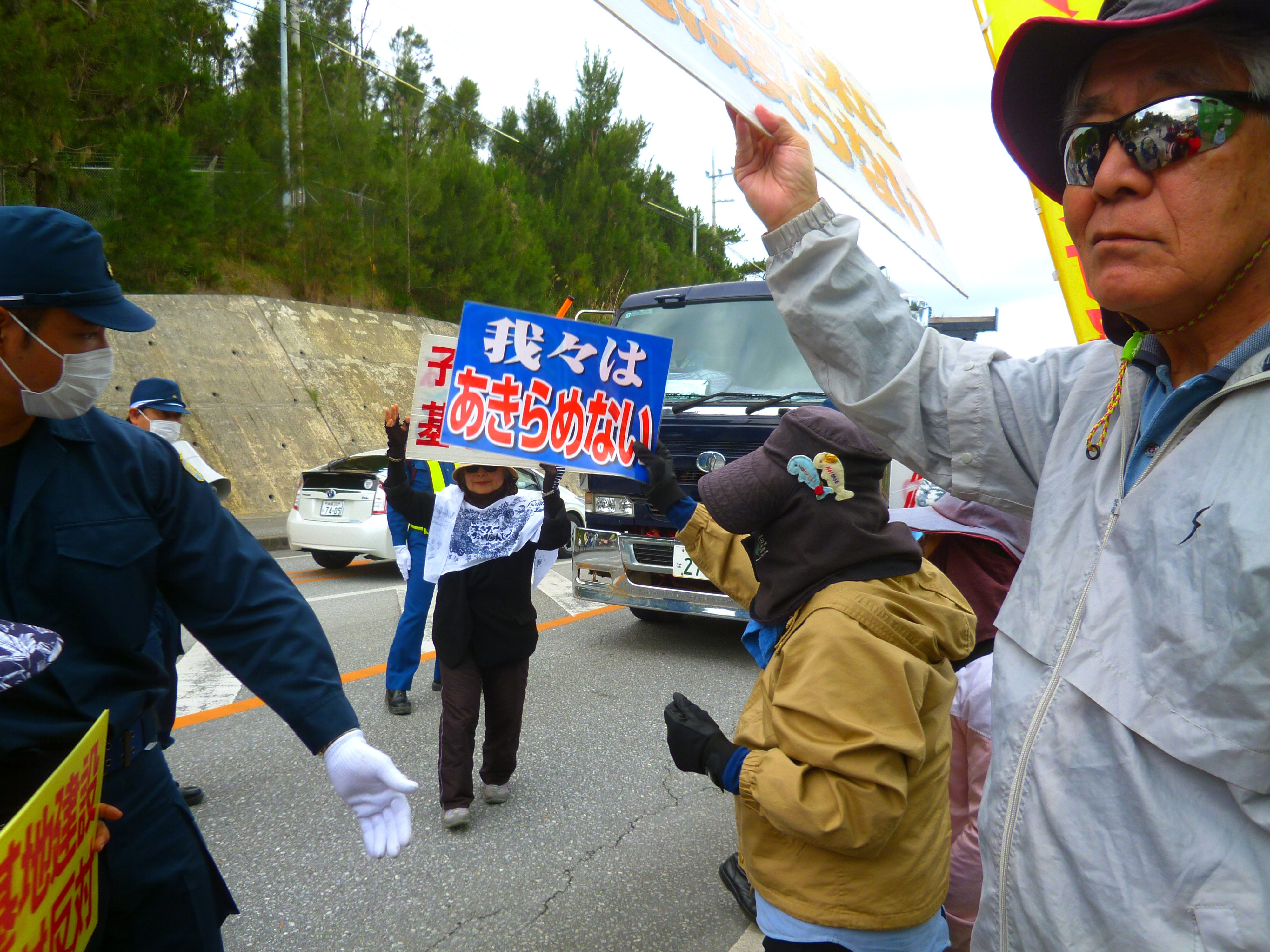 ダンプが入った後も抗議を続ける人たち。