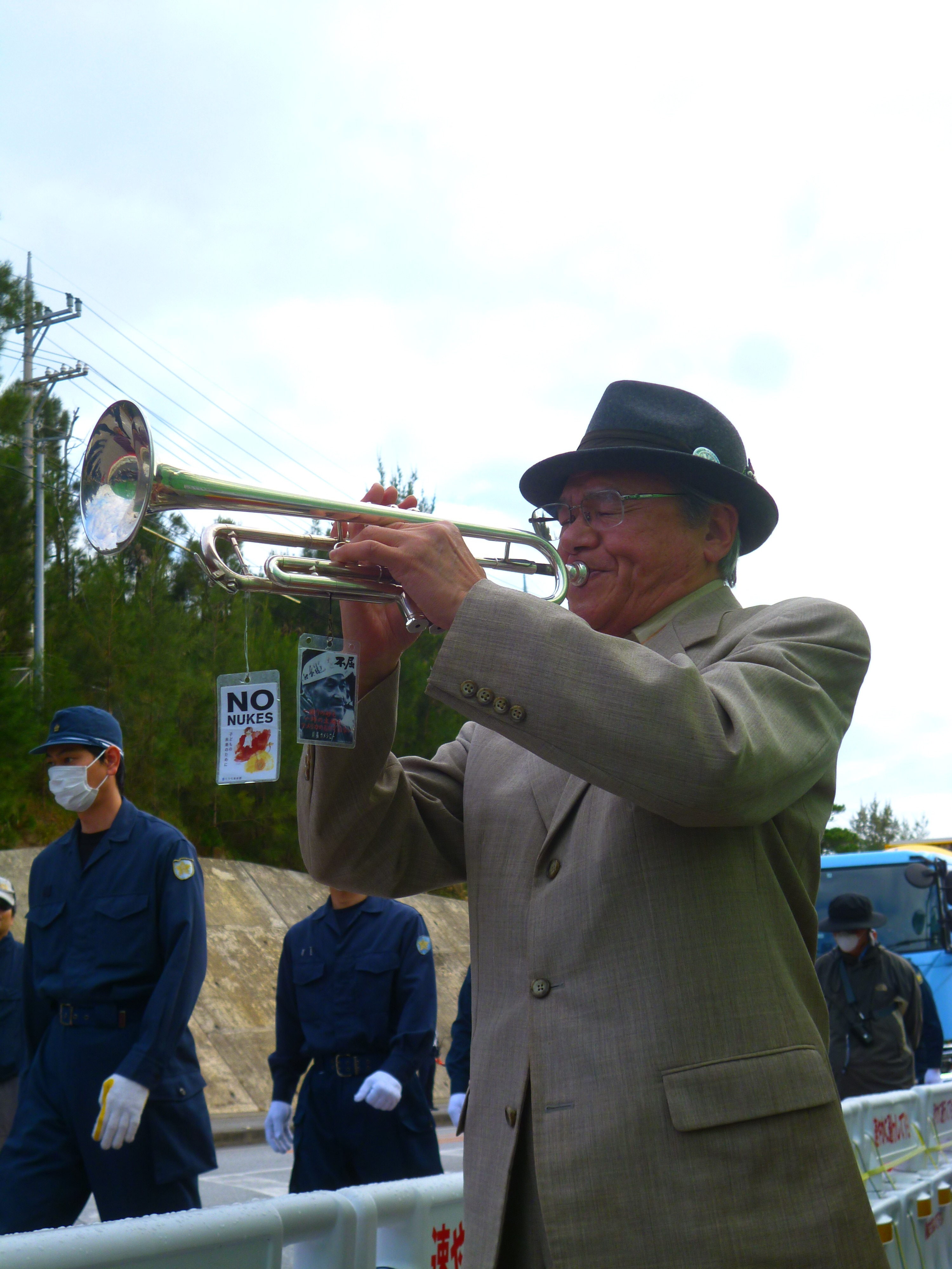 県外から年に何回か参加するトランぺッターの男性。勇壮な伴奏で抵抗の歌を歌い、元気が出た。